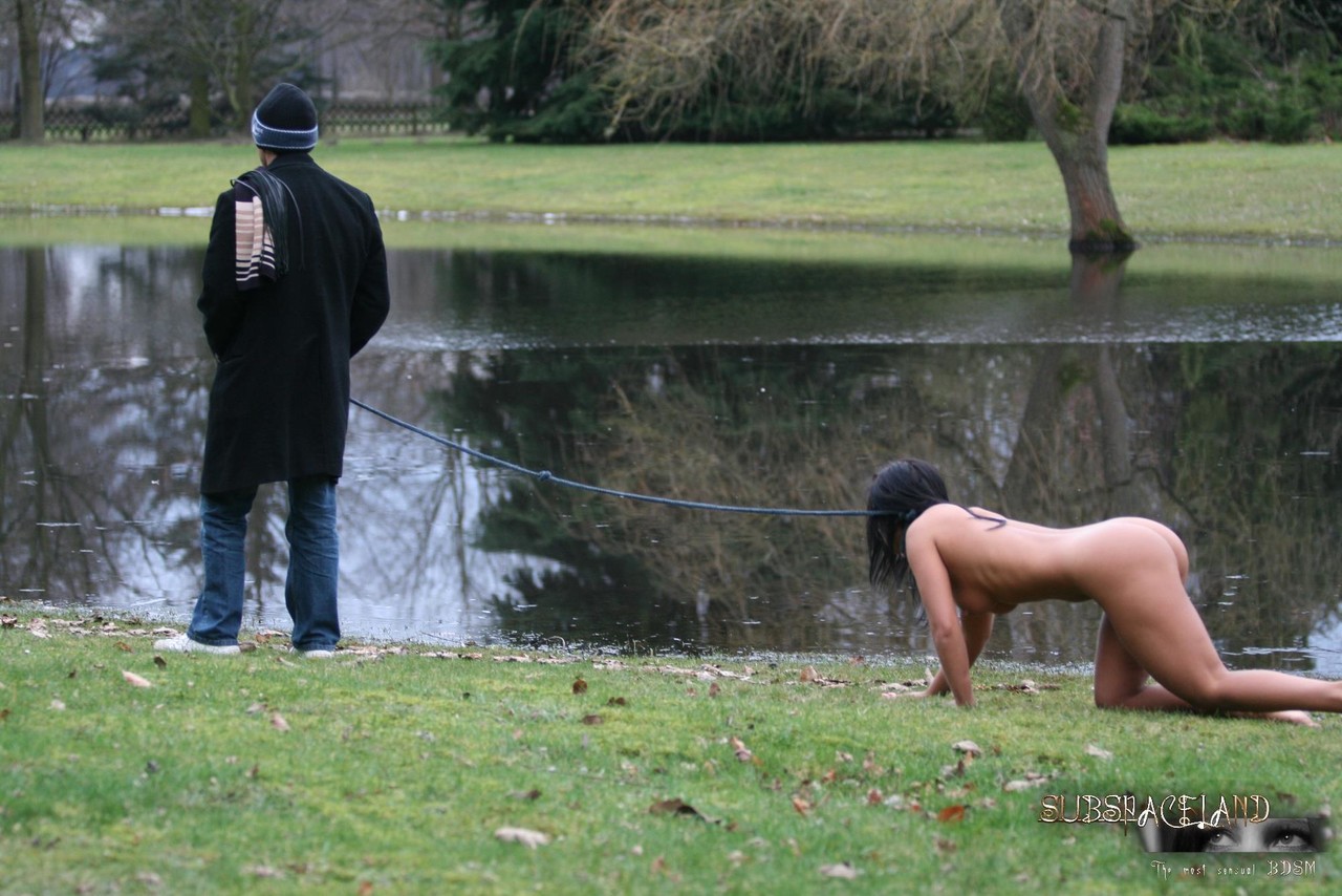 Barbara Devil, a sexy MILF sub, crawls naked on a leash through the cold outdoors before a strict flogging—Outdoor BDSM, bondage, feet, and pussy play in one kinky Skinny-MILF gallery.