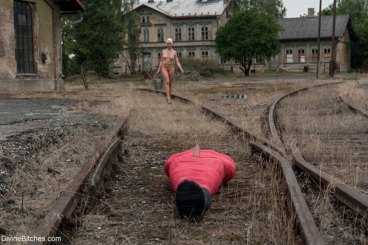 Blonde dominatrix Lorelei Lee grinds her pussy on a mummified slave’s face with a strap-on beside train tracks in outdoor BDSM humiliation.