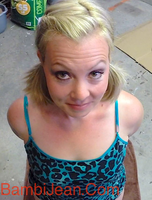 Slutty MILF Bambi Jean worships huge white cock with a hands-free outdoor blowjob, teasing in non-nude short hair style.