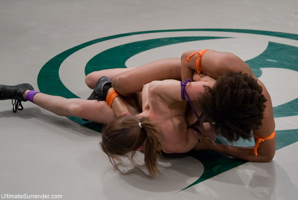 Amber Rayne and Yana Jordan battle nude on the mat, slick sweat, tight bondage, Ebony MILF lesbian surrender—ultimate sporty BDSM pics.