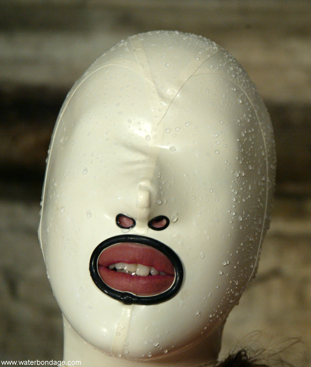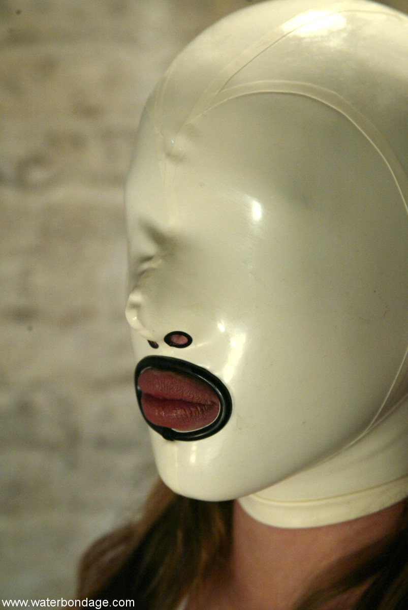 Jade Marxxx submits to water bondage in dripping latex, blindfolded MILF with tiny natural tits teased through wet panties, mature BDSM fetish gallery.