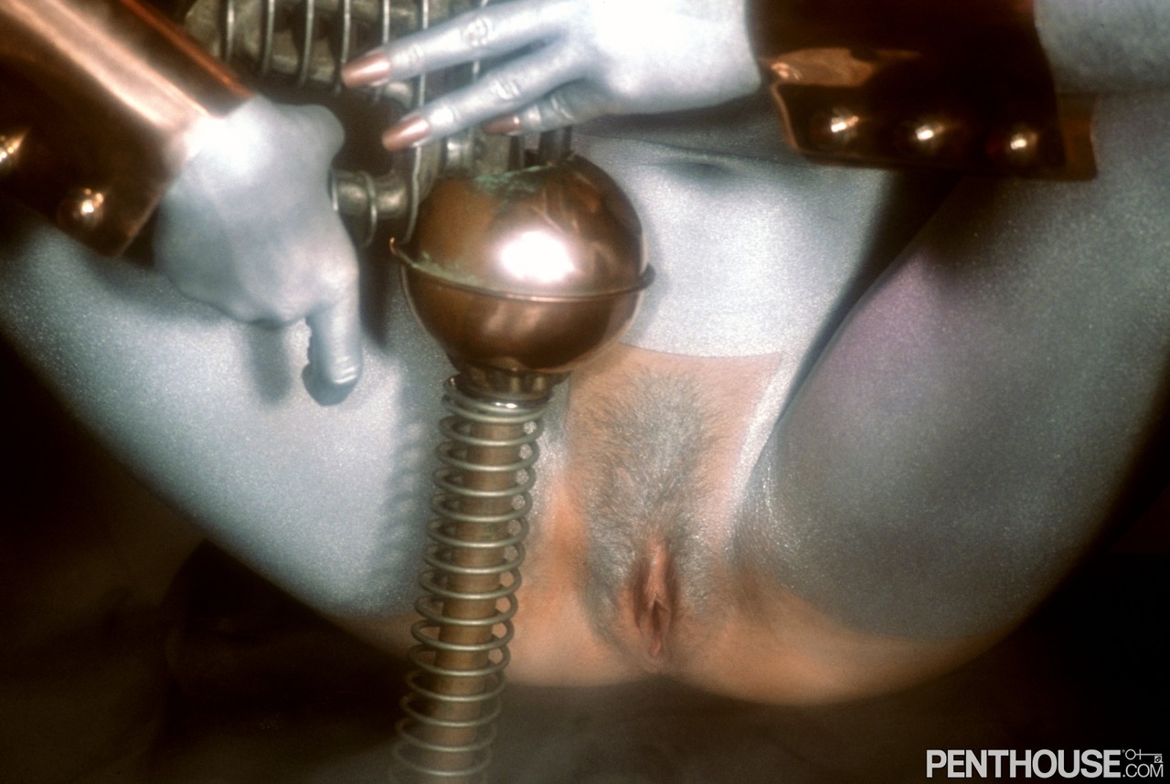 Blonde MILF bombshell Janine Lindemulder strips as robo-cop, flaunting huge fake tits and killer curves in steamy glamour gallery for mature pornstar fans.