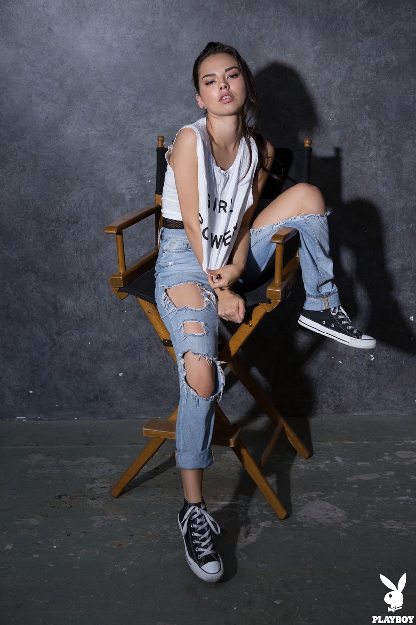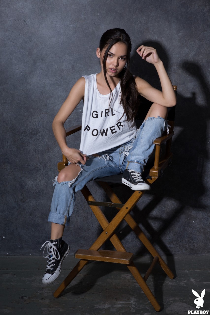 Gorgeous centerfold Dominique Gabrielle strips outdoors to reveal her perfect slender body, spreading in erotic solo glamour shoot.