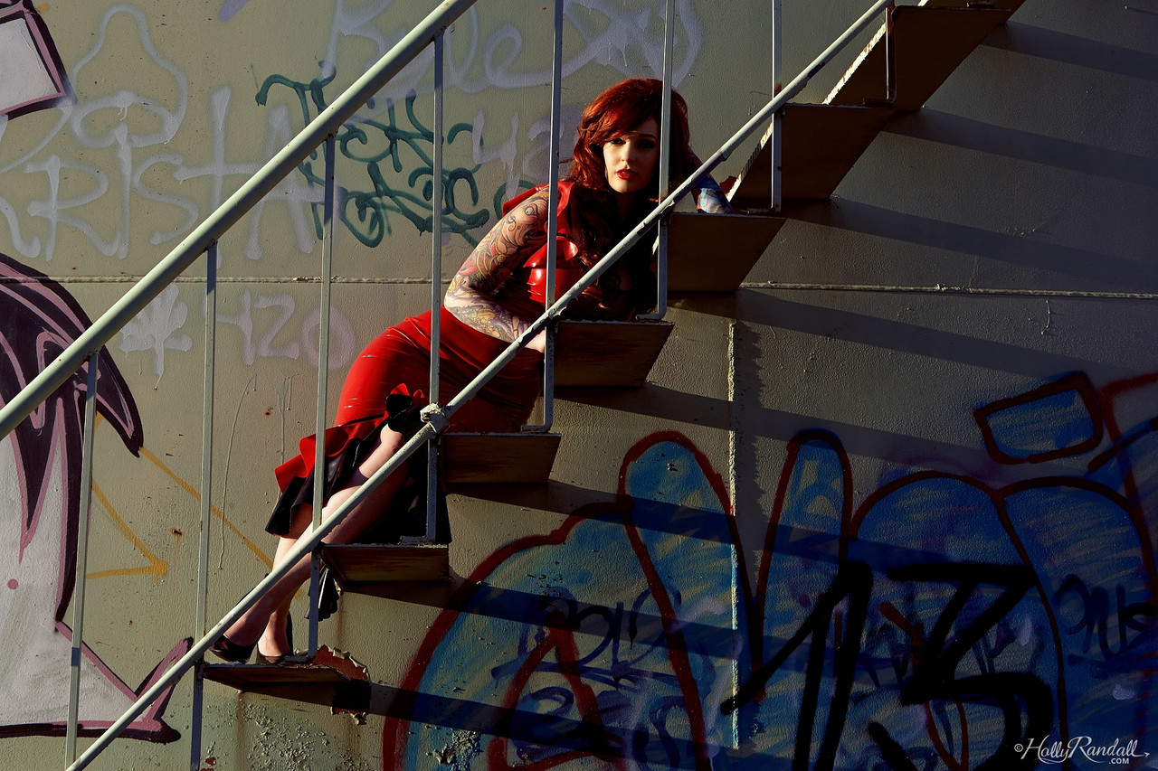 Home Redhead Goth Vanessa Lake Peels Red Latex Dress On Chemical Tank Stairs