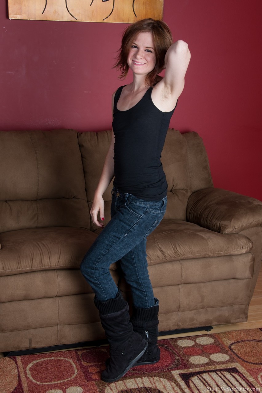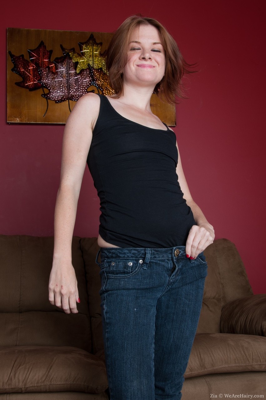 Cute redhead Zia peels tight jeans, spreads wide to flaunt her fiery ginger muff, hairy erotica, tiny tits, boots, open pussy, sexy ass.