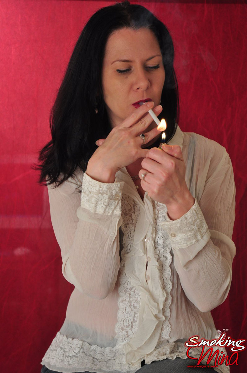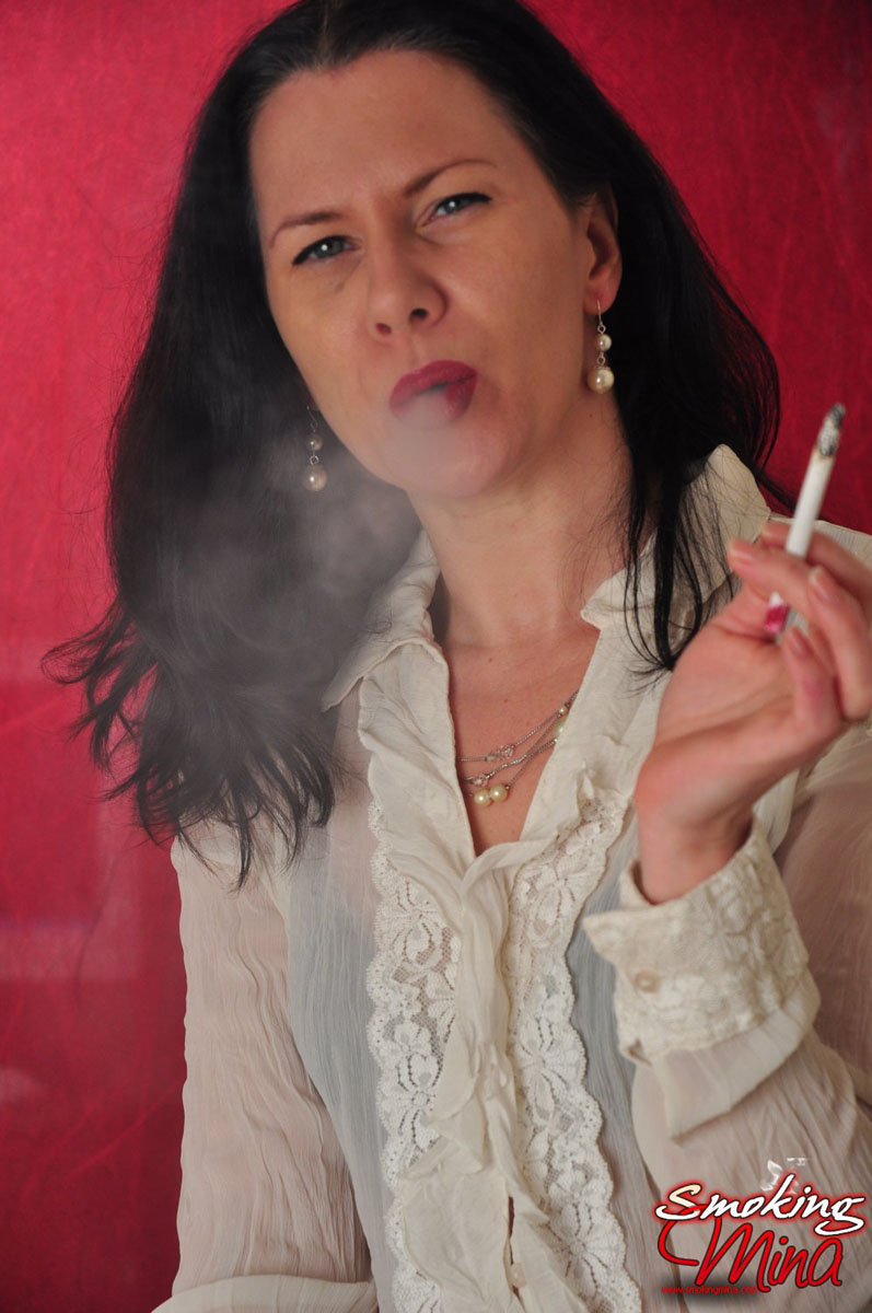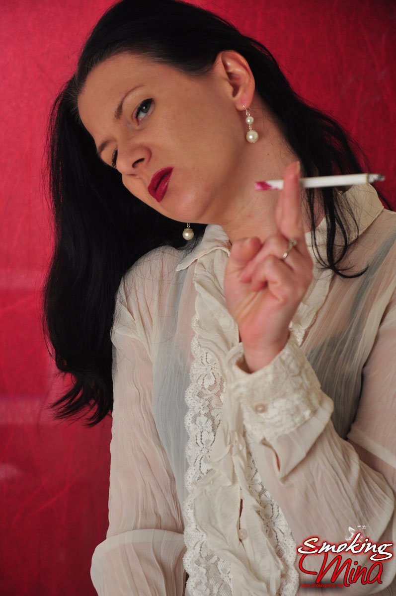 Brunette Chick In Sheer Blouse Smoking Seductively - Photo 3 / 15