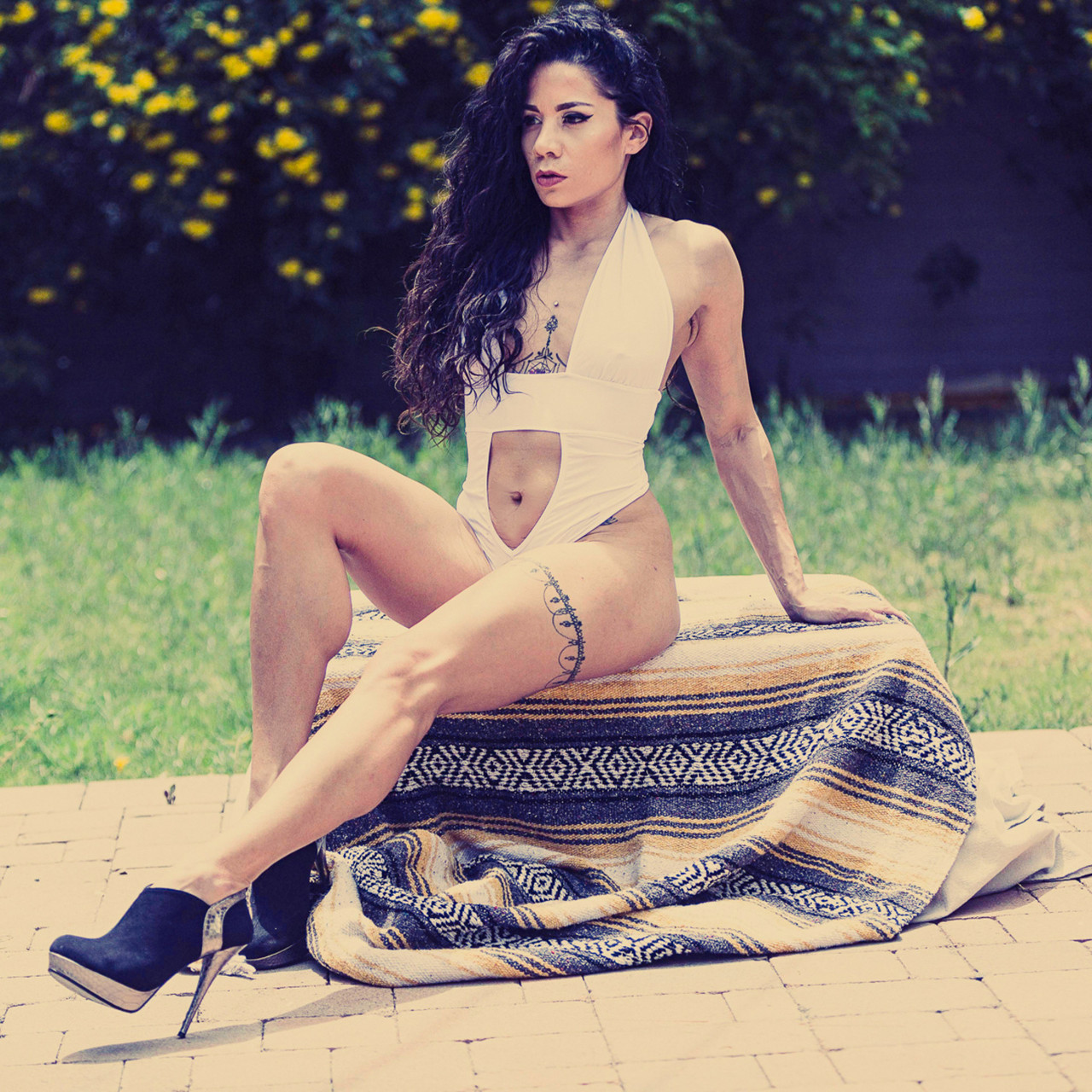 Sultry brunette inked MILF Kara Dasha teases in a sheer white bodysuit outdoors, flashing fetish curves, long legs and curly allure without stripping.