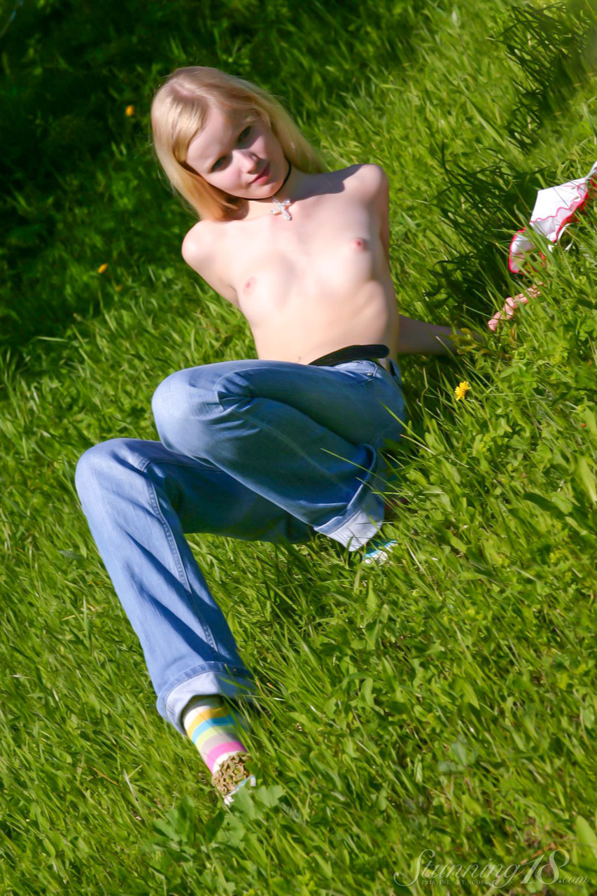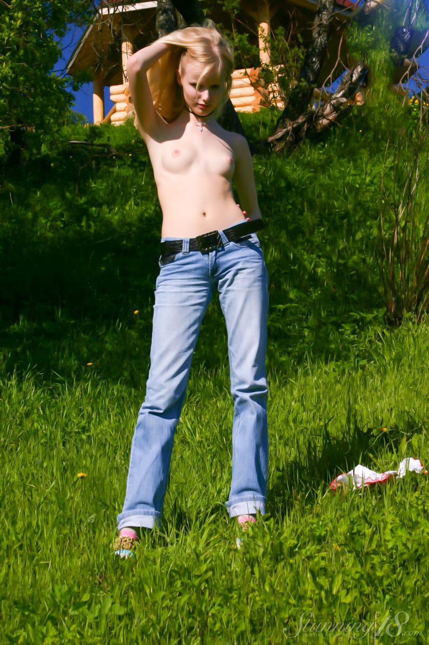 Petite blonde teen Yana F strips outdoors, flaunting her skinny frame, tiny tits, tight jeans and cute panties before posing naked in the forest.