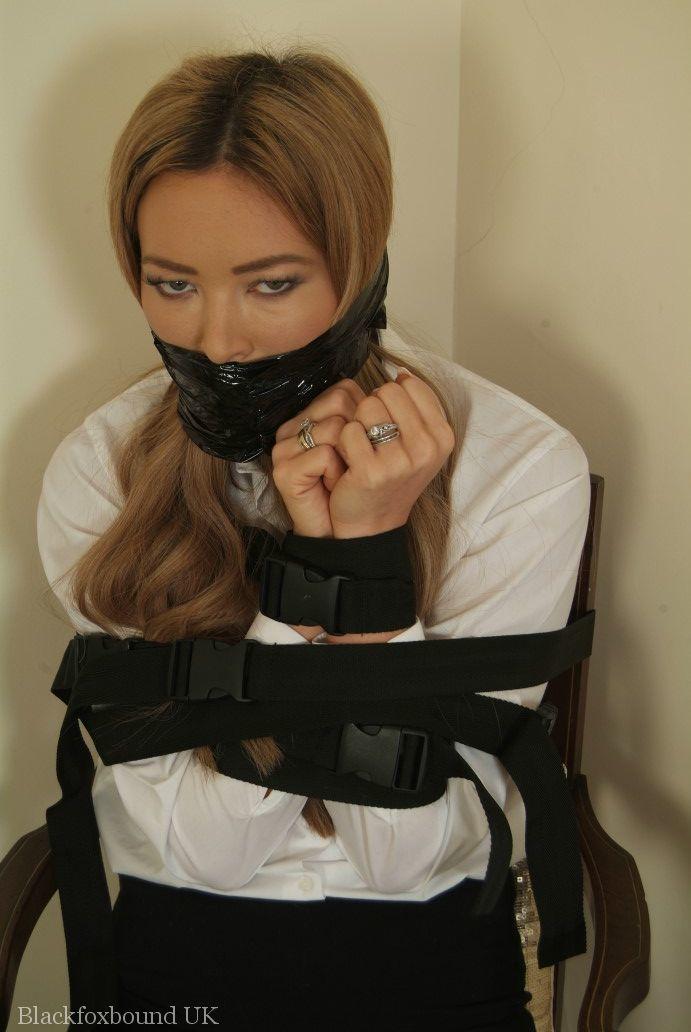 Watch a sexy solo girl bound to a chair, silenced with black duct tape in tight skirt, high heels and clothes—perfect BDSM bondage tease without nudity.