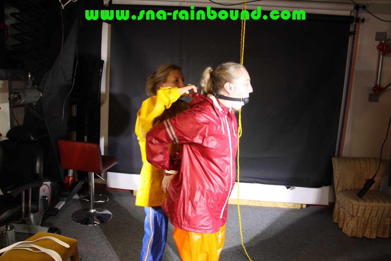 Submissive lesbian bound and ball-gagged in clothed bondage noose, moaning under her dominant mistress's teasing control.