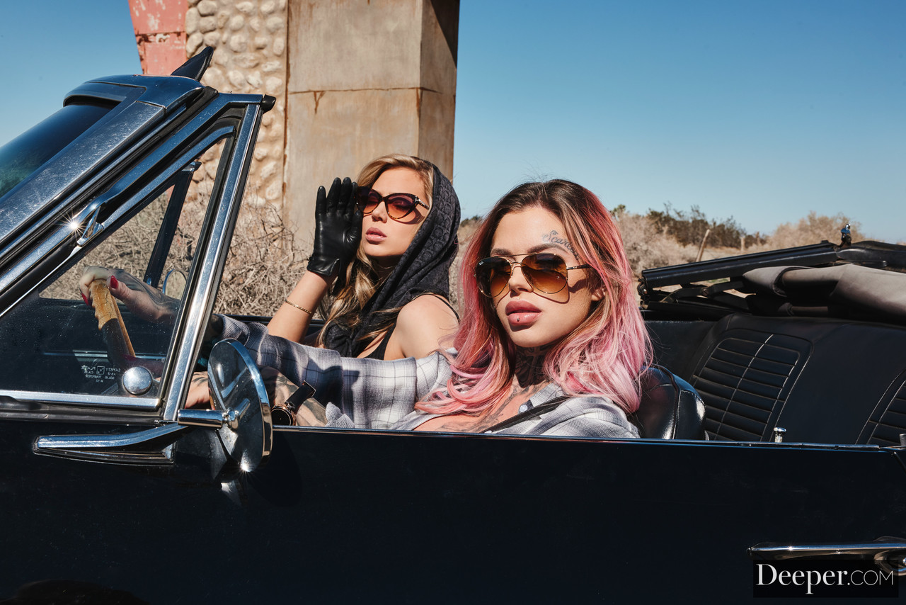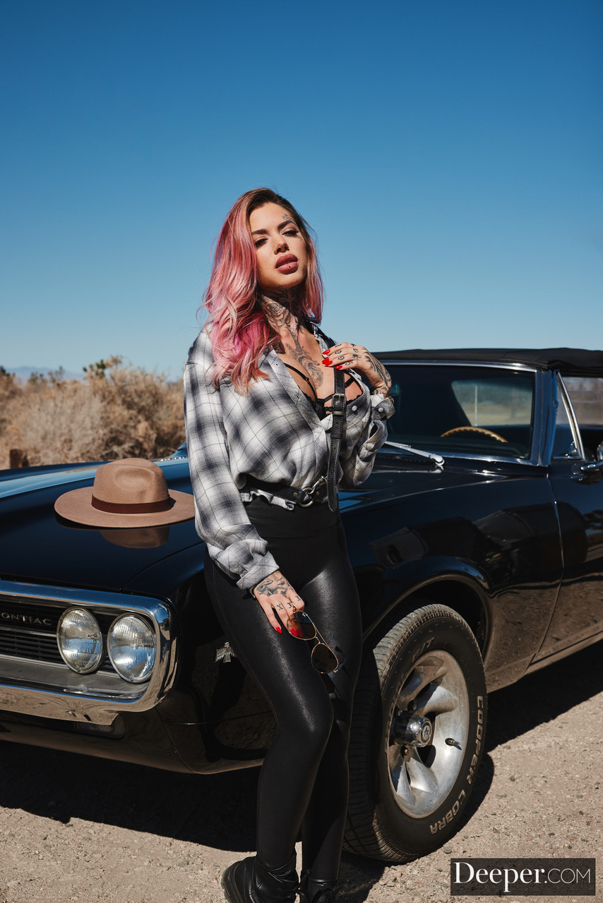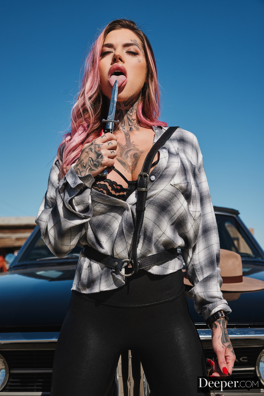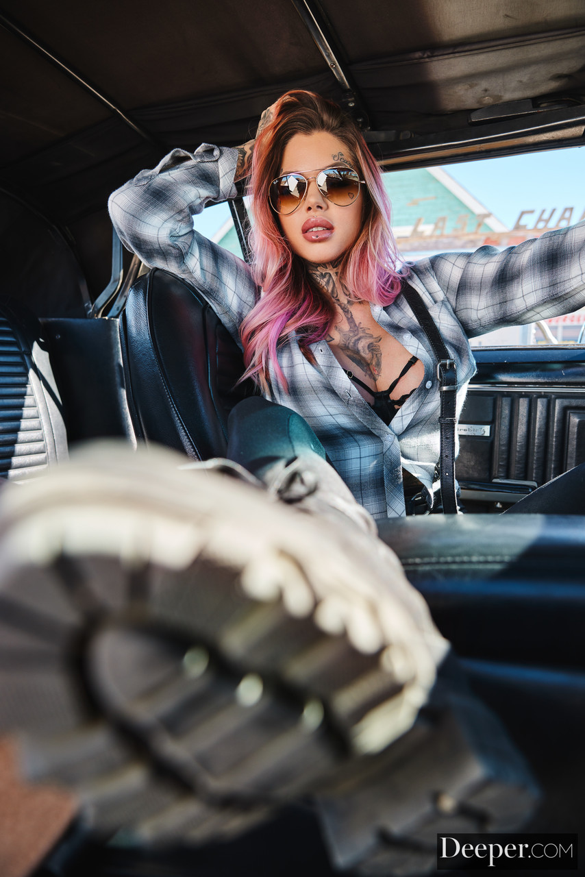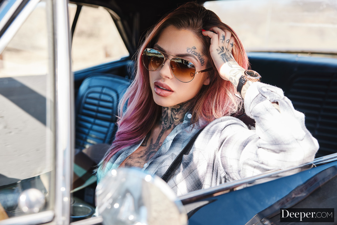 Tattooed redhead pornstar Chantal Danielle in outdoor BDSM fetish scene with glasses, big tits, handjob, blowjob and hardcore car sex action