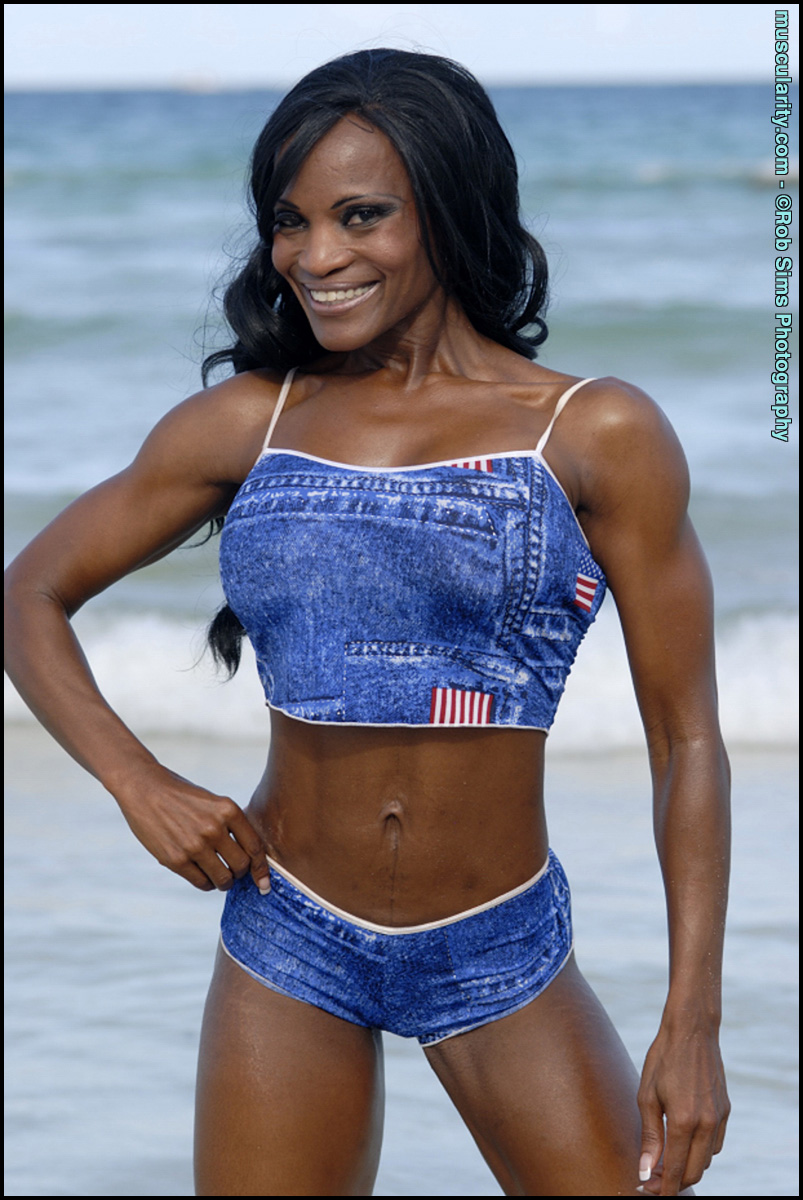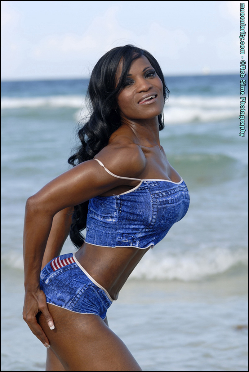 Black Bodybuilder Debra Dunn Flexes Her Muscles At The Beach In Denim Attire - Gallery Information