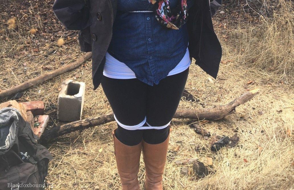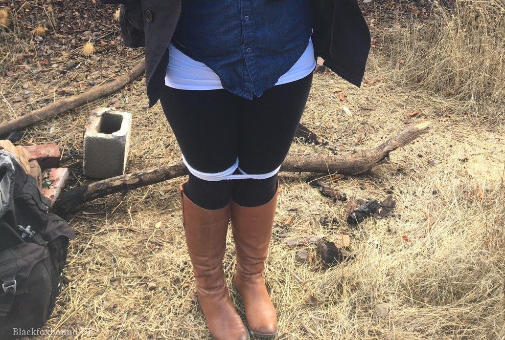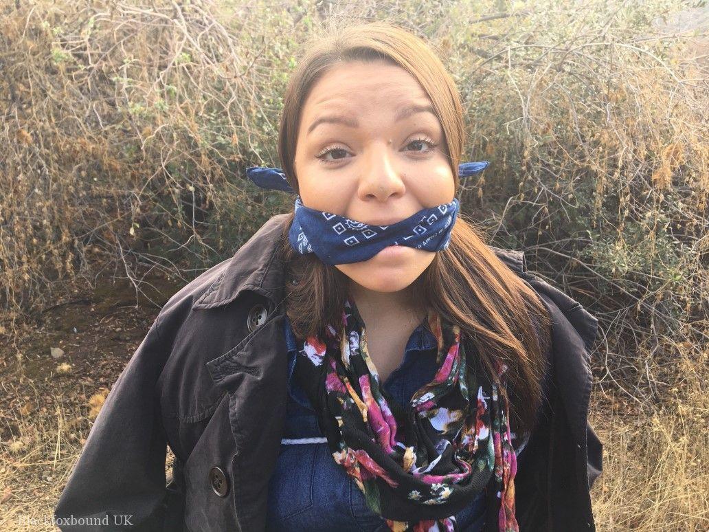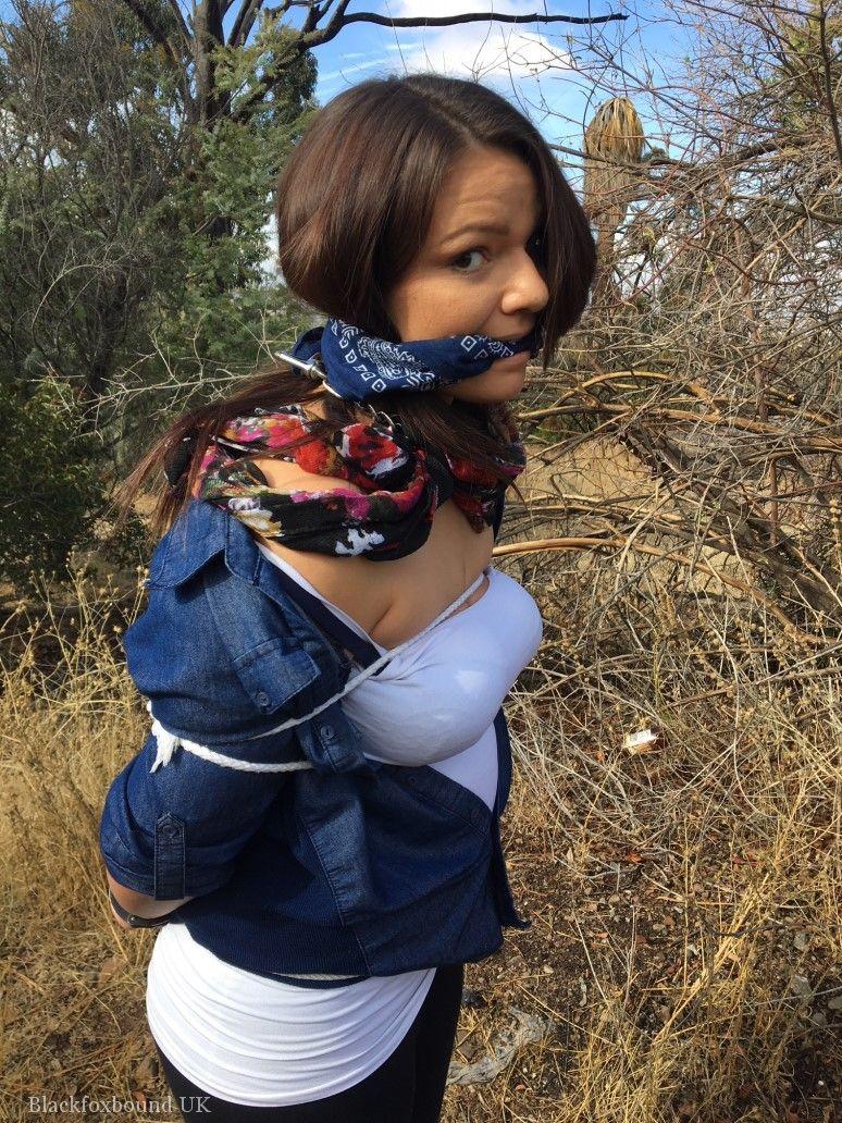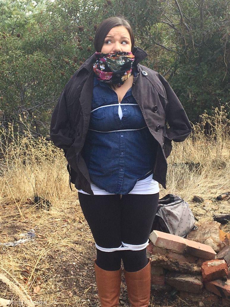 Fully-clothed Czech BBW teen tied with rope, cleave-gagged in scrubby woods outdoor BDSM bondage scene, busty chubby natural tits, boots, thick teen bondage.