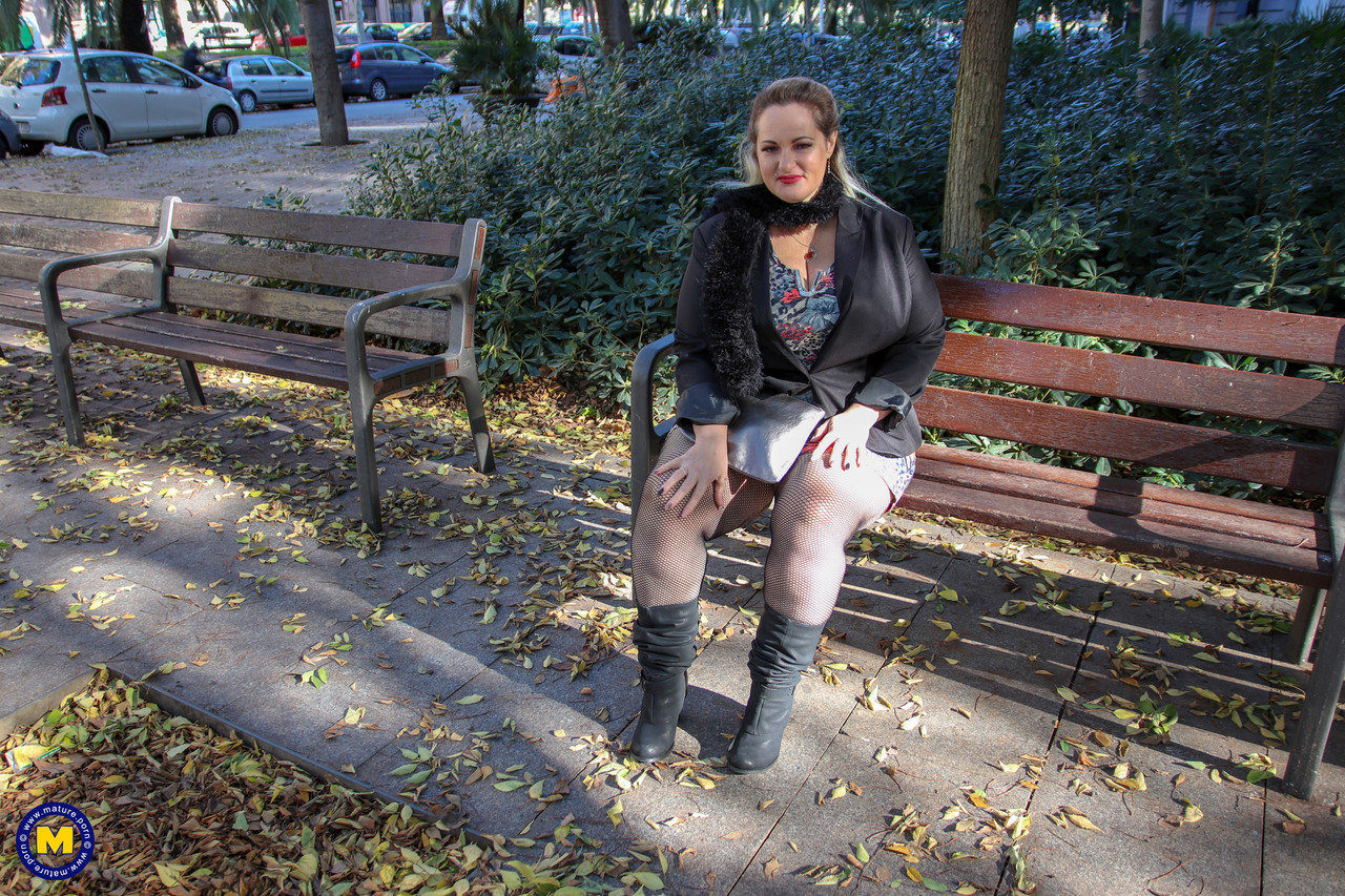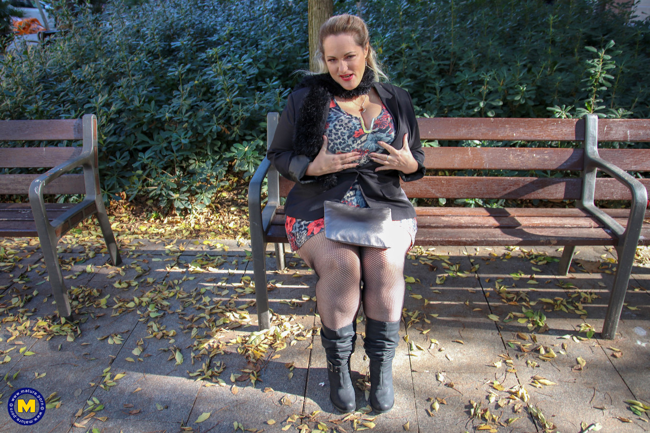 Busty mature BBW Sophia Lola teases outdoors, flashing huge breasts in tight skirt and sheer pantyhose—thick, curvy, amateur milf perfection.