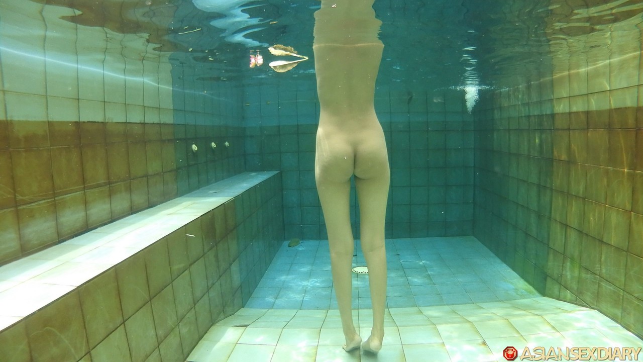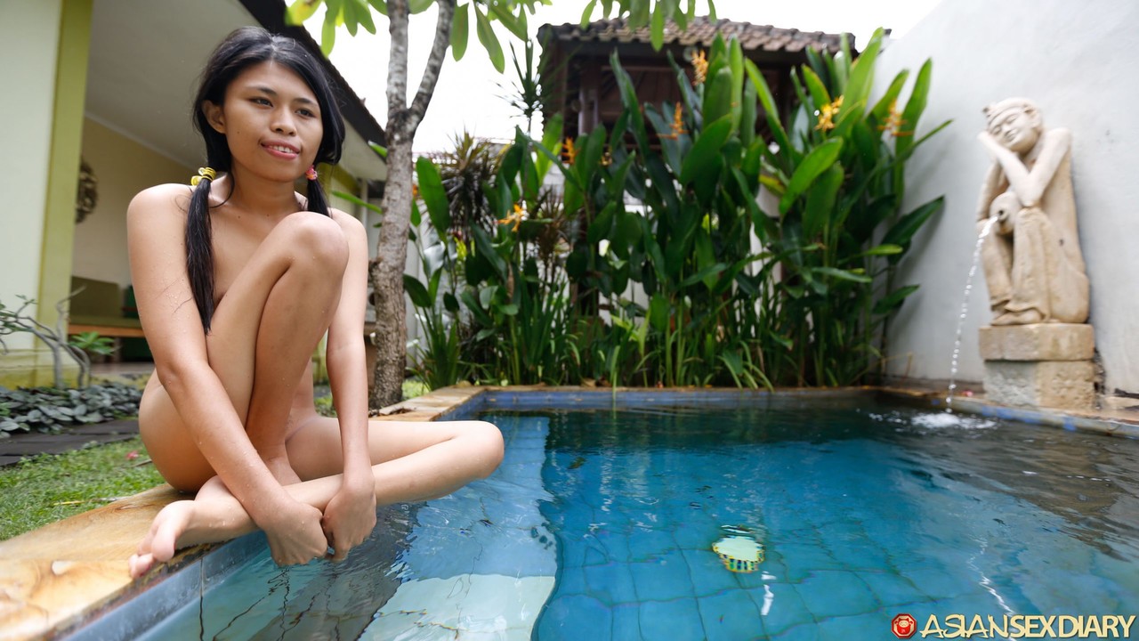 Naked cute Asian teen Adelia shows off her huge hairy pussy and tight wet slit outdoors by the pool, petite amateur teasing with pigtails and tiny feet.