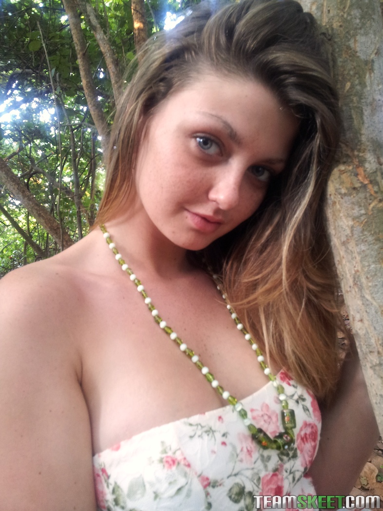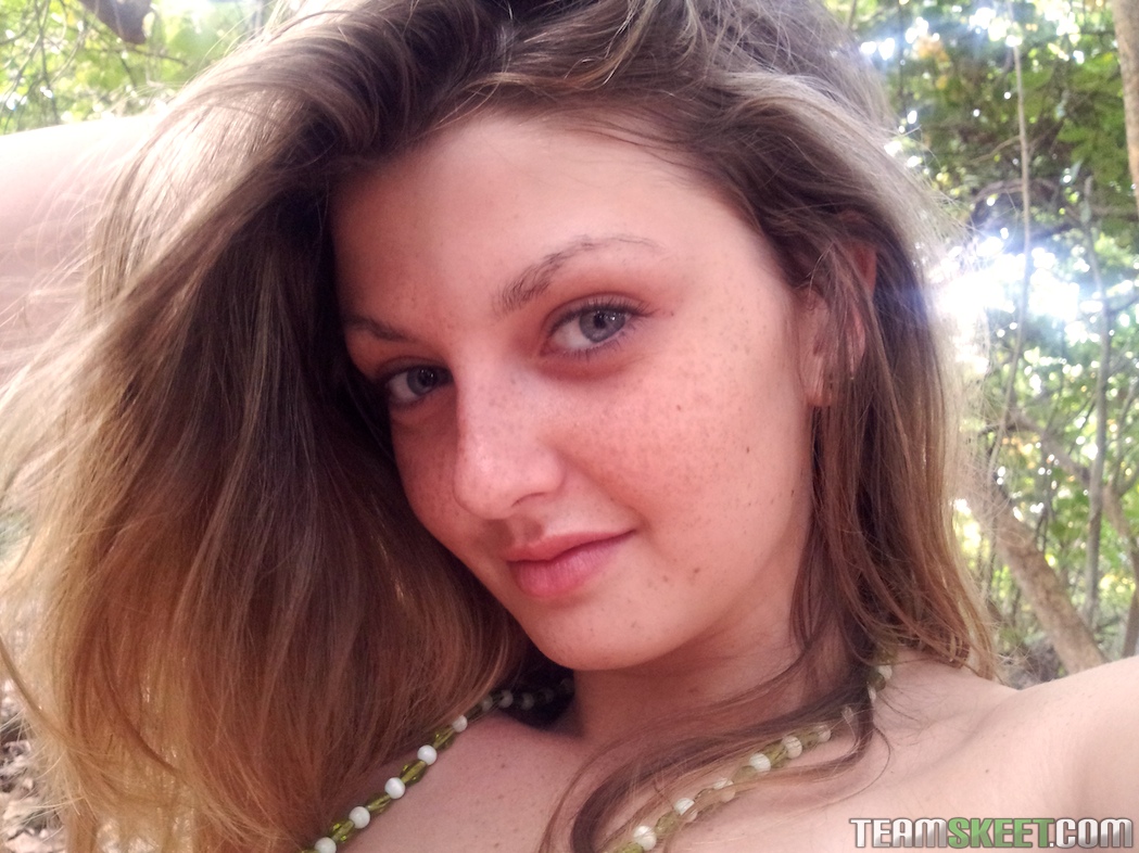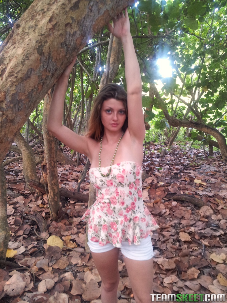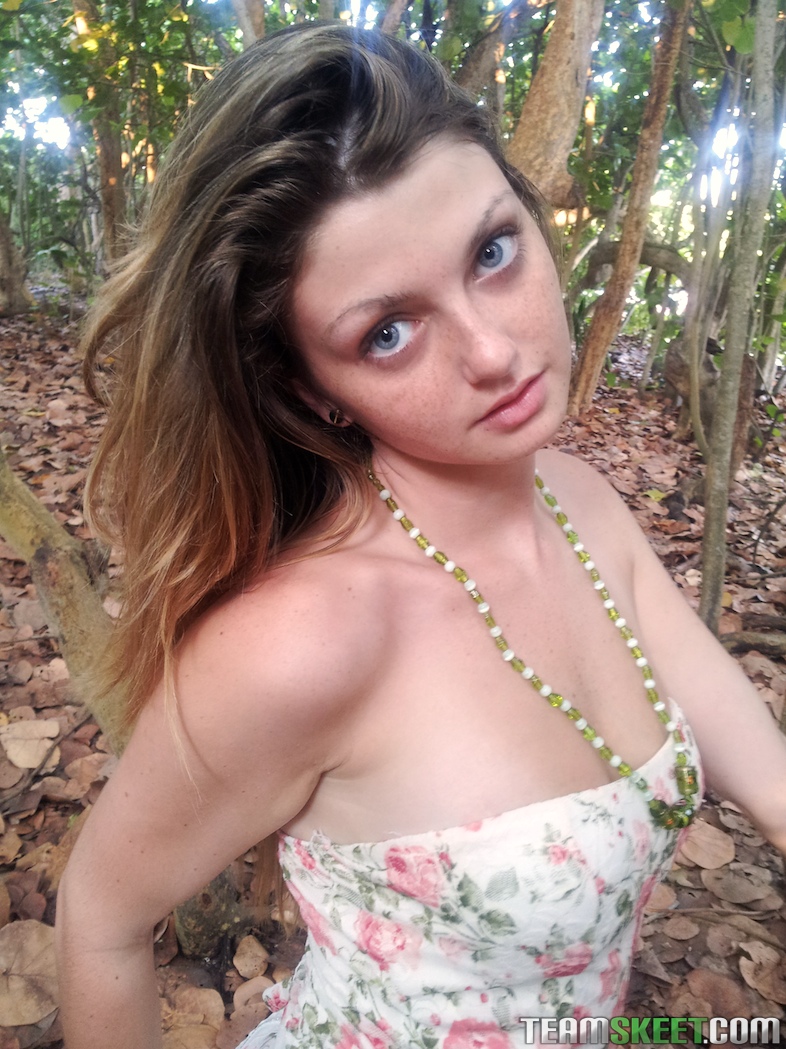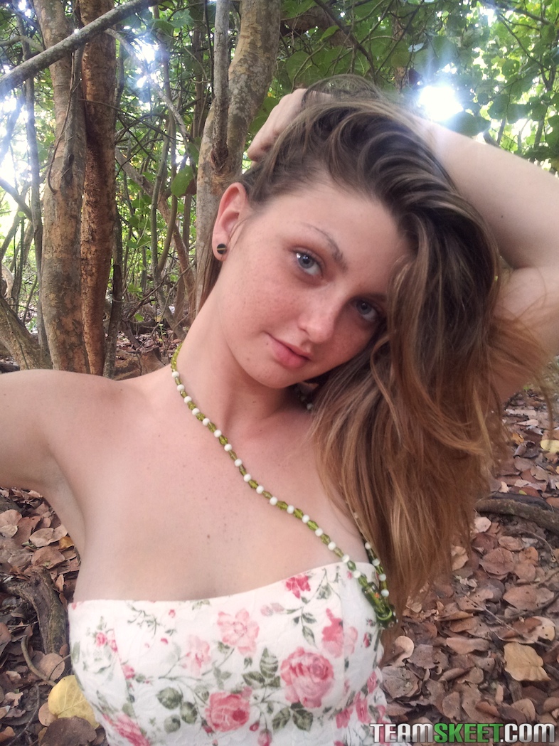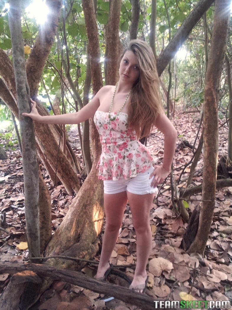 Big-eyed blonde teen Staci Silverstone strips in the woods to flaunt her natural tits and tight amateur pussy in this hot outdoor gallery.