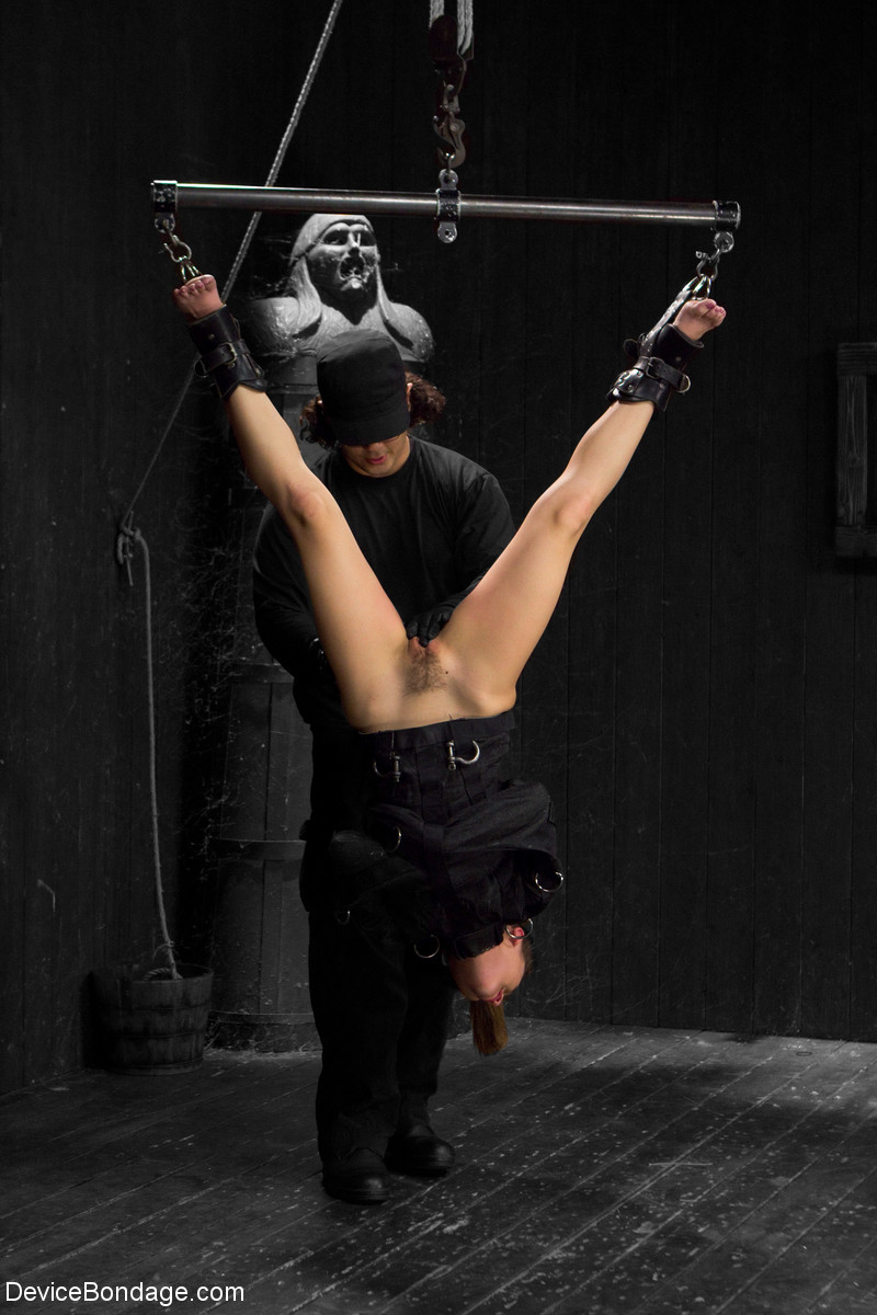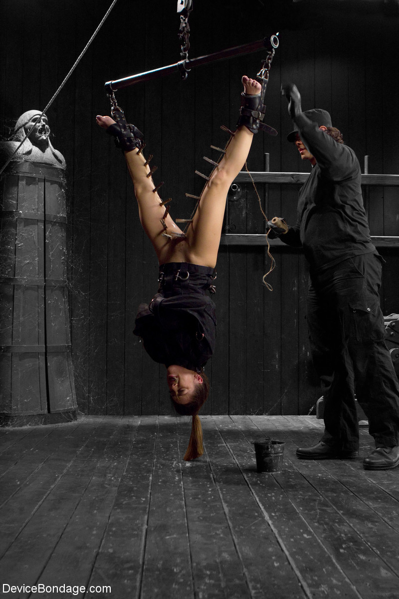 Kristina Rose is tied upside-down by a bootylicious Latina MILF in high-heeled BDSM bondage, exposing her perfect petite pussy in wet close-up for ultimate fetish tease.
