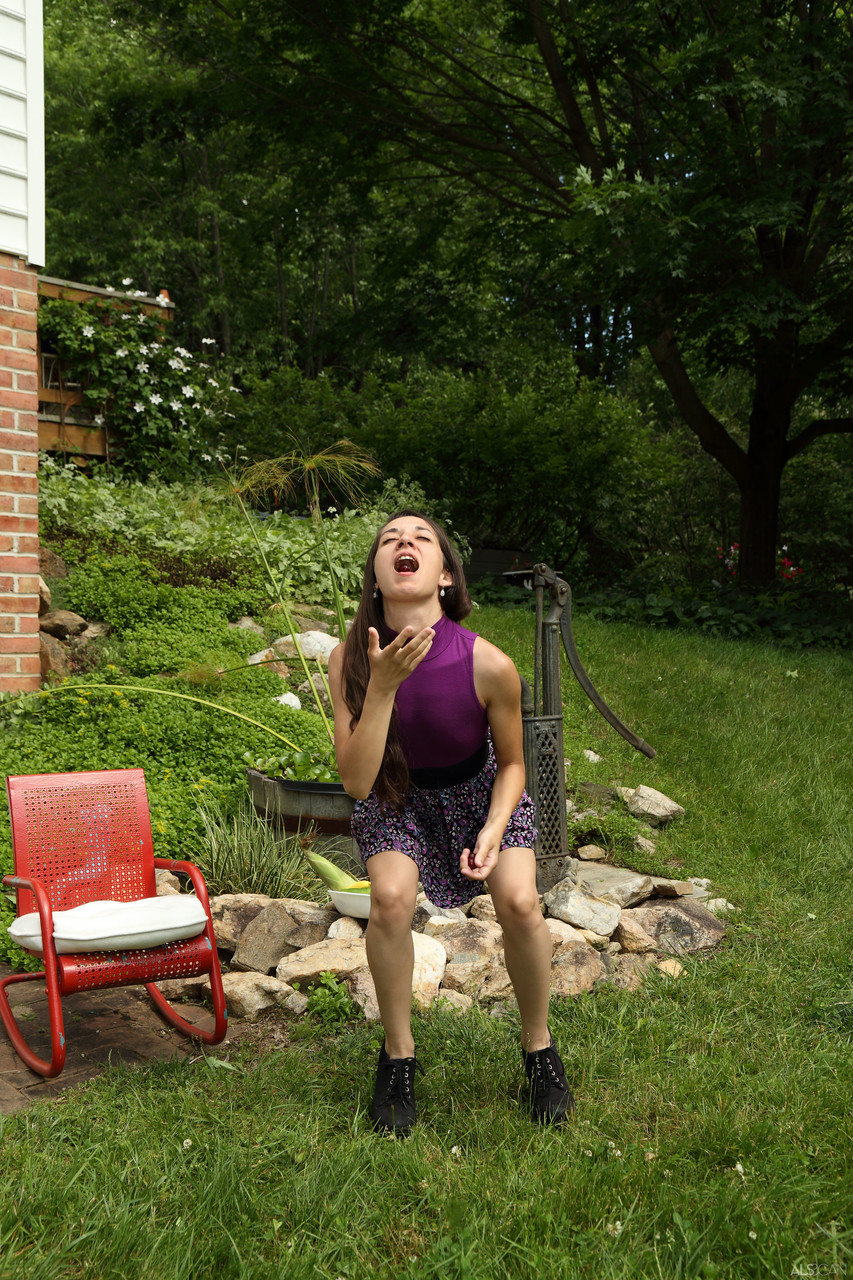 Petite teen Freya Von Doom flashes upskirt pussy outdoors, sticks veggies deep, pees & teases long nipples in no-panties short skirt.