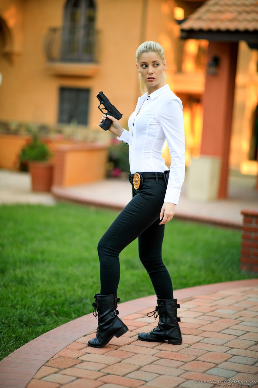 Blonde Female Cop Strips To Black Boots On Condo Walkway - Gallery Information