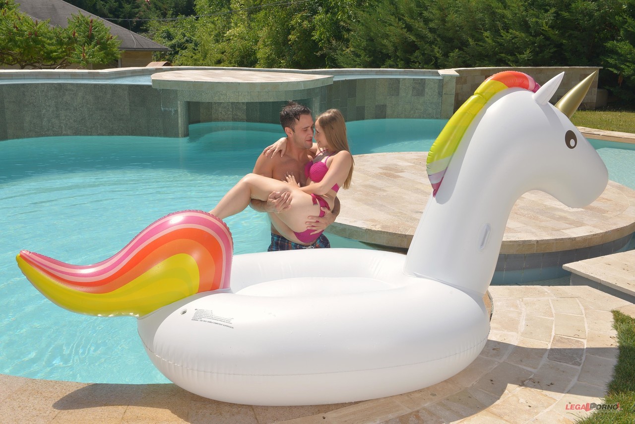 Watch sexy Czech teen Lady Bug strip her bikini by the pool, deepthroat a big cock, get pounded hard and take a hot cum blast in her cute mouth.