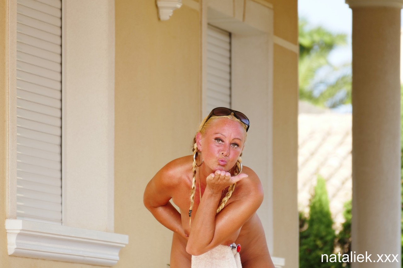 Tall Spanish MILF Natalie K pleasures outdoors by the pool, showcasing natural tits and pigtails while enjoying blowjob and anal toy play in amateur action.