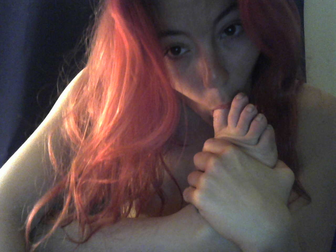 A adolescente amadora de cabelo rosa Bangz Houze se exibe em meias, chupa os próprios dedos do pé, depois brinca com brinquedos em sua vagina apertada na frente da câmera para os fãs do fetichismo de chupar dedos do pé.