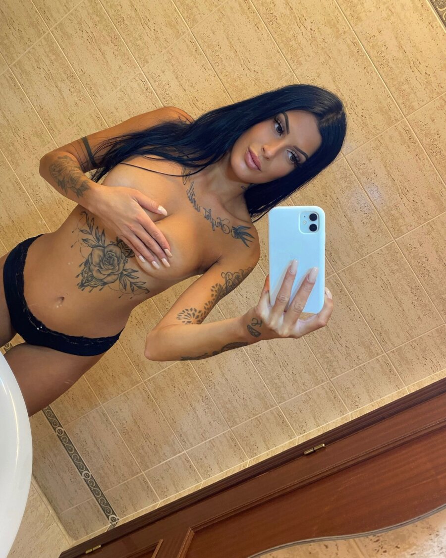 Babe tatuada e glamourosa tira selfies provocantes no espelho com lingerie de renda, exibindo peitos grandes, bunda redonda e tatuagens perfeitas—pornô amador que você vai adorar.
