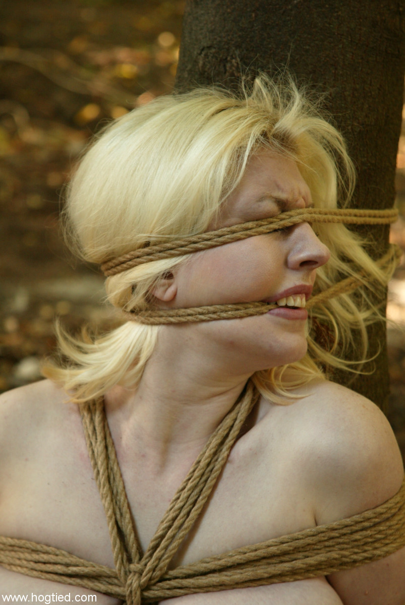 Loira amarrada e vendada se submete a uma implacável foda com máquina ao ar livre, sua buceta raspada perfurada por um enorme consolo enquanto a bondagem emoldura seus grandes seios pálidos e mamilos compridos.