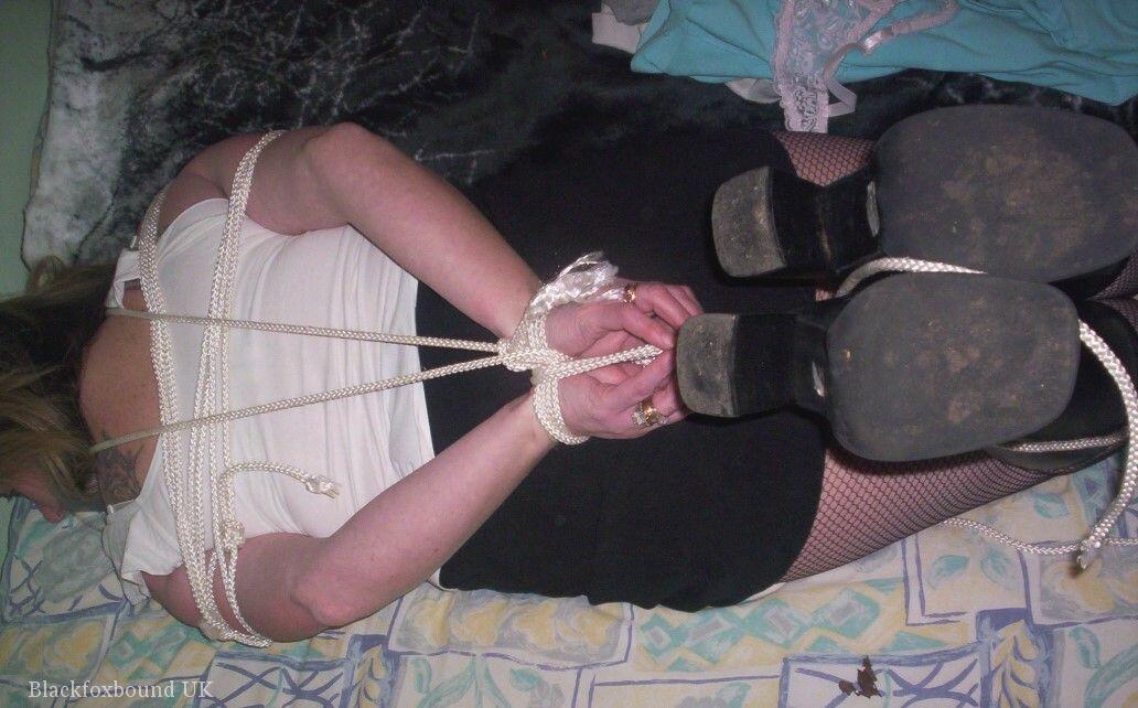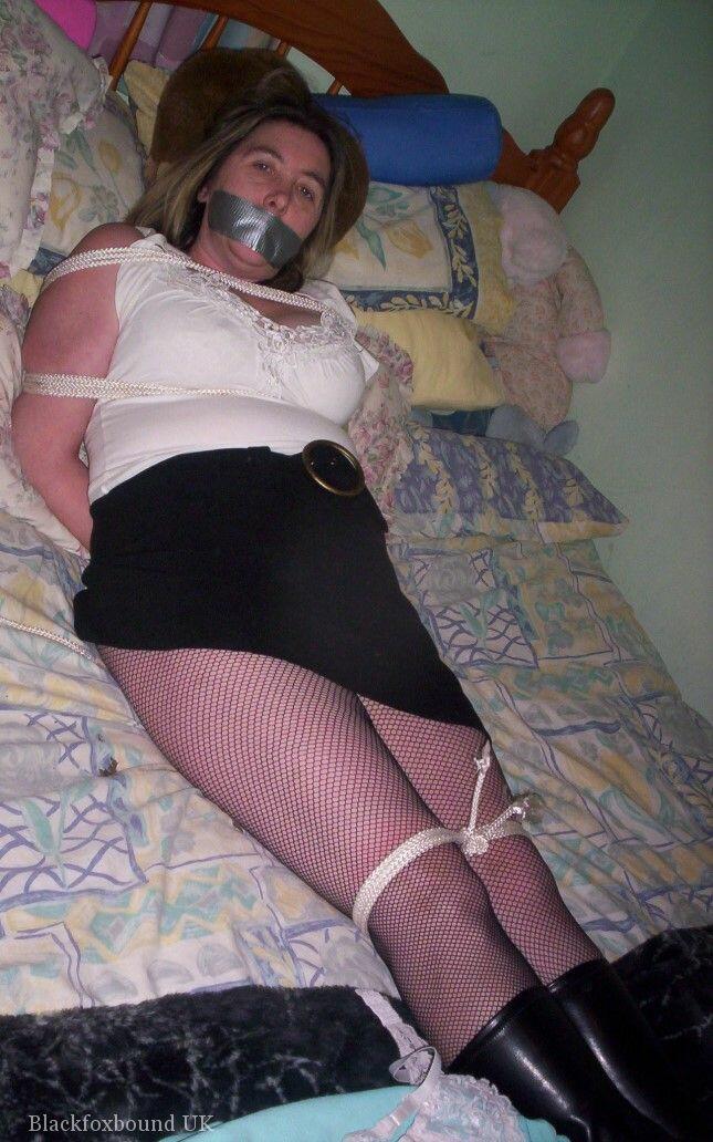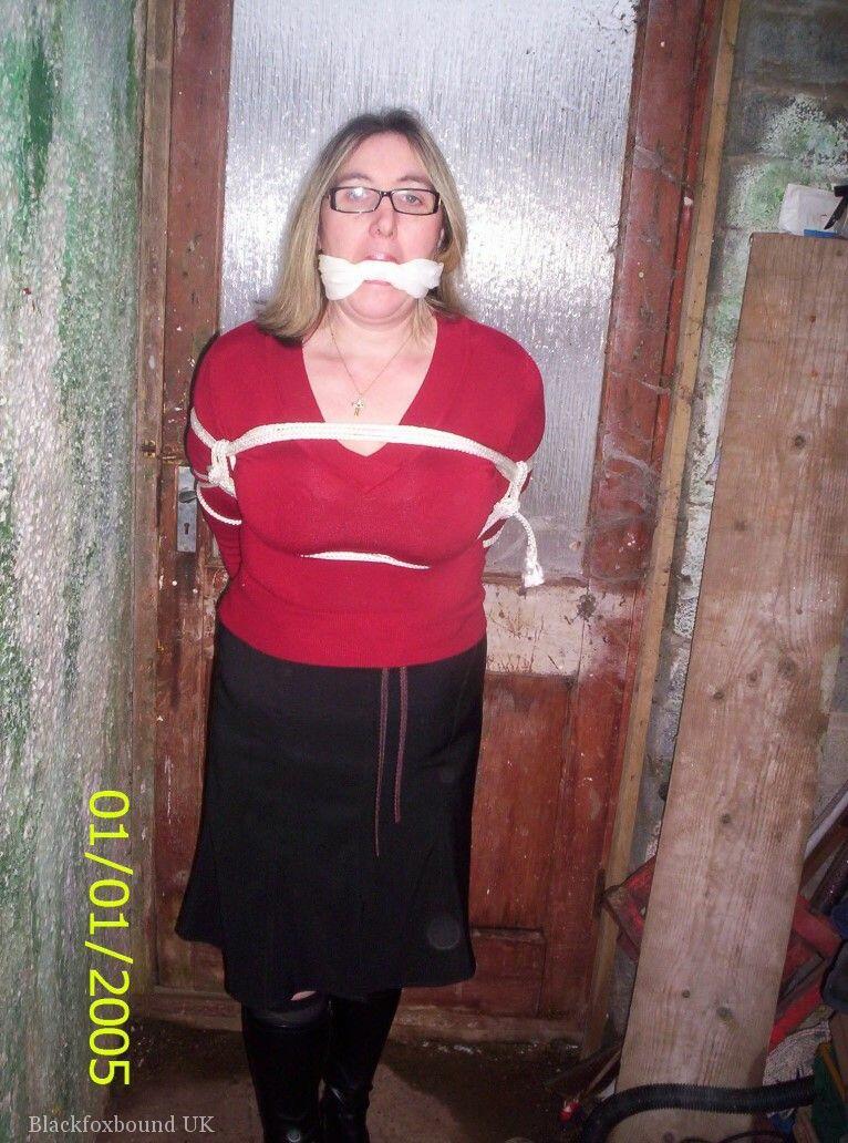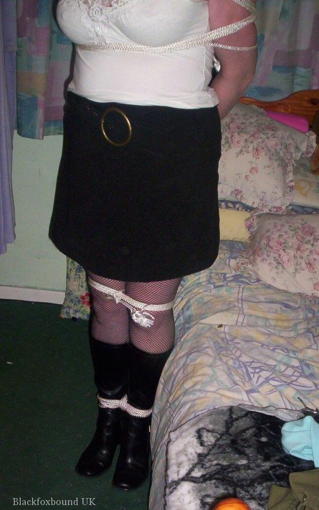 Uma amadora madura com seios naturais, óculos e botas amarrada com corda, de saia e meias; provocação com vistas para cima, mordaça apertada, calor BDSM real.