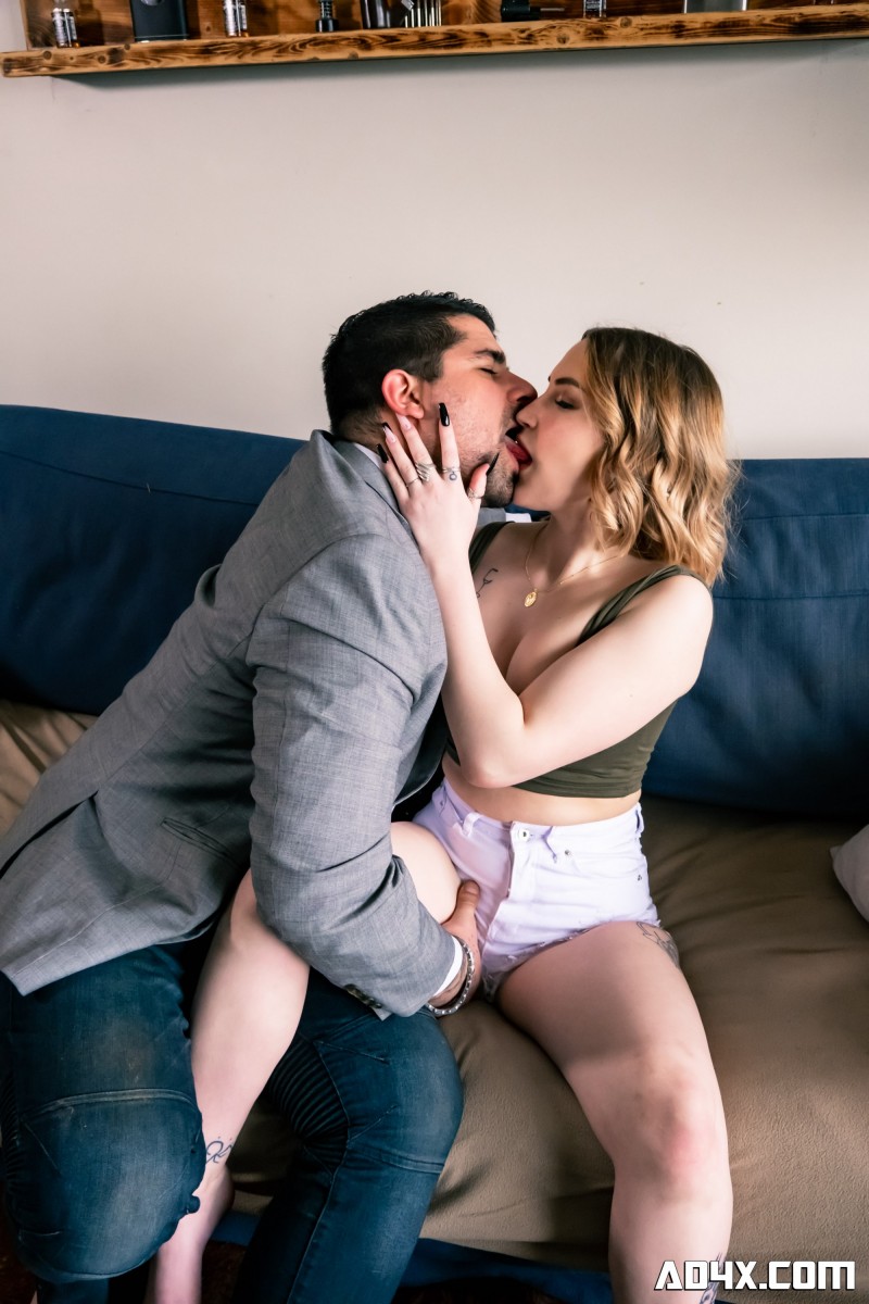 A loira explosiva Nina Rox faz pose em um sofá Chesterfield, exibindo seus mamilos perfurados e bunda perfeita em shorts minúsculos antes de um encontro apasionado de pornô realista com um stud bem dotado.
