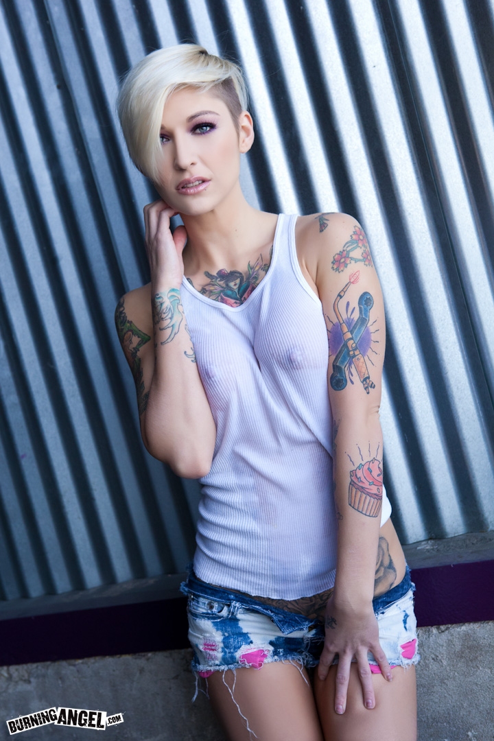 Loira sensual de cabelo curto, com curvas tatuadas, provoca de salto alto, abrindo sua fenda molhada e exibindo seu corpo esbelto e bustudo.