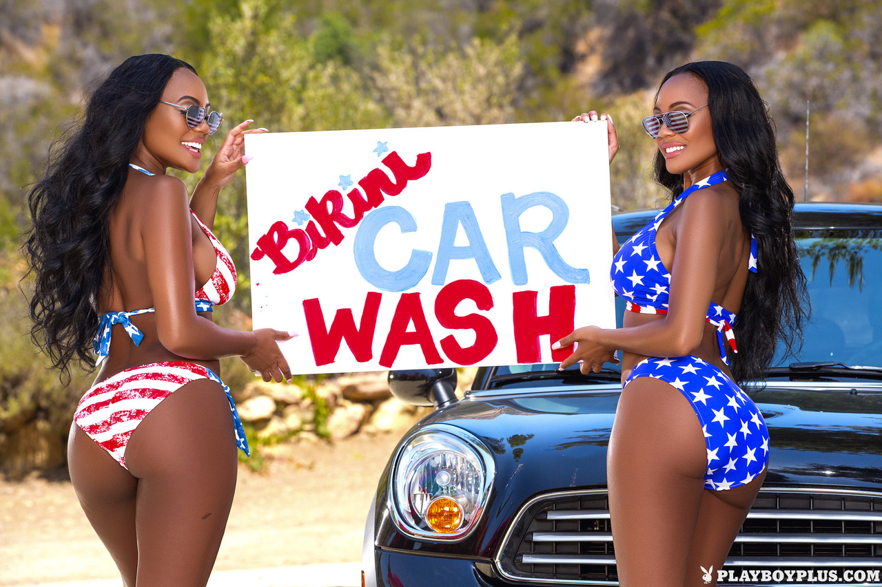 As irmãs negras Brittany e Brandi Kelly lavam seus perfeitos bocetas negros e seios grandes em um ensaio fotográfico ao ar livre - sensuais garotas de biquíni pingando água.