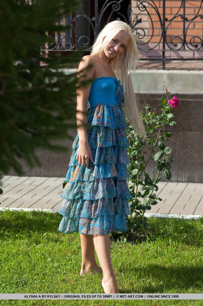 A doce loira Alysha A provoca lá fora sem calcinha, exibindo sua buceta teen raspada e pernas longas ao glamouroso sol europeu.