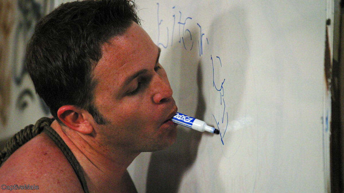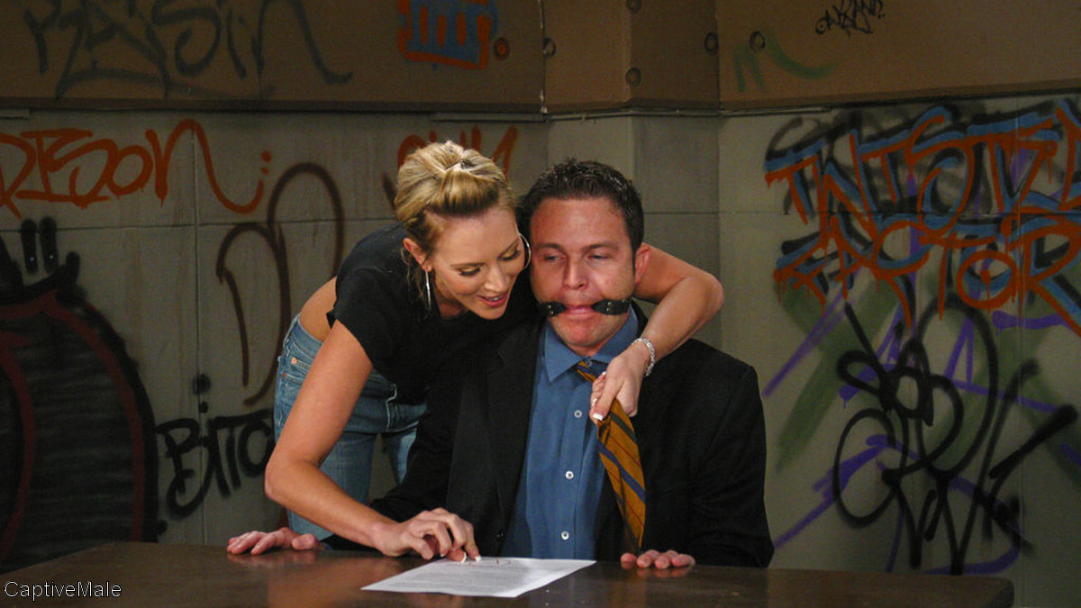 Audrey Leigh domina Dick Richards em uma cena quente de pegging femdom, uma professora de jeans e salto alto o amarra para uma ação de bondage BDSM hardcore.