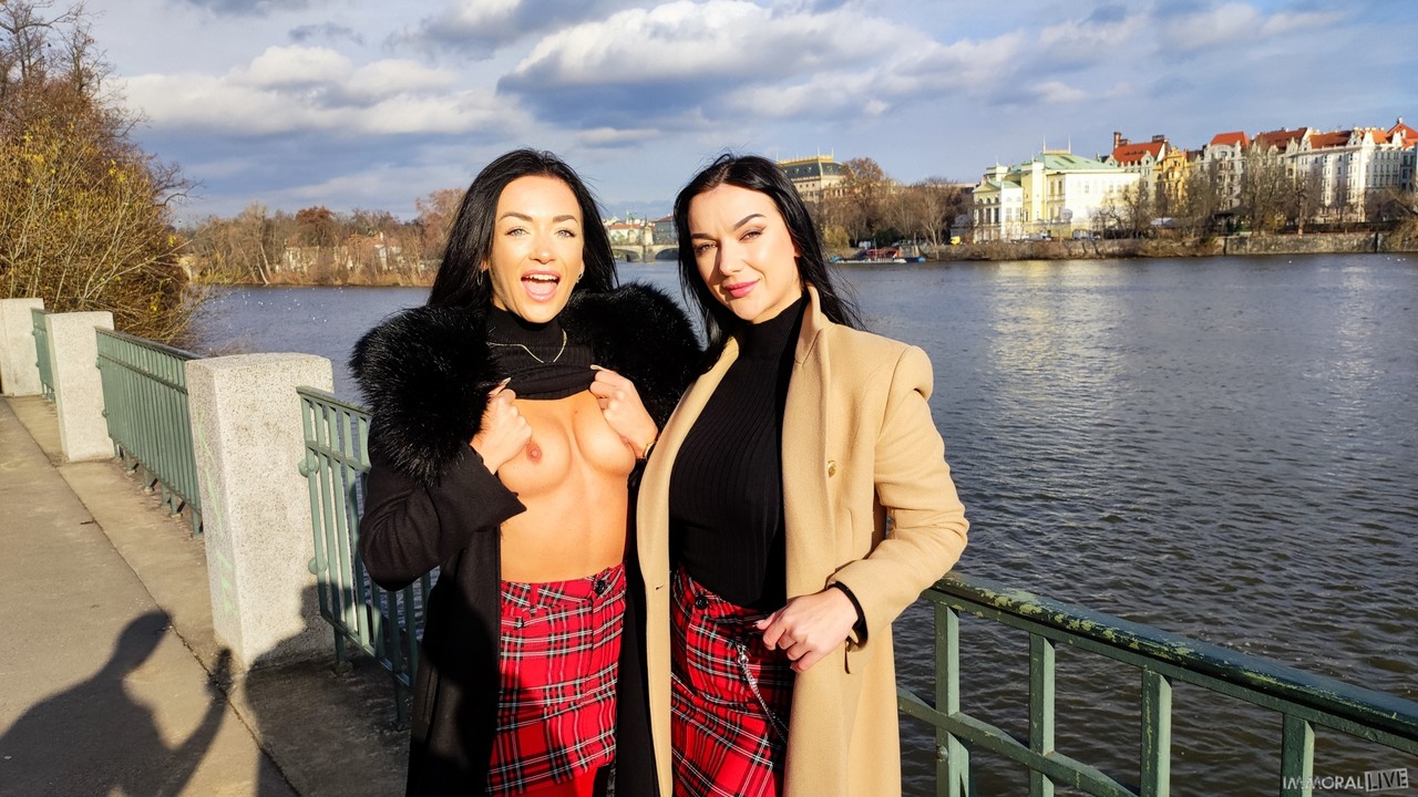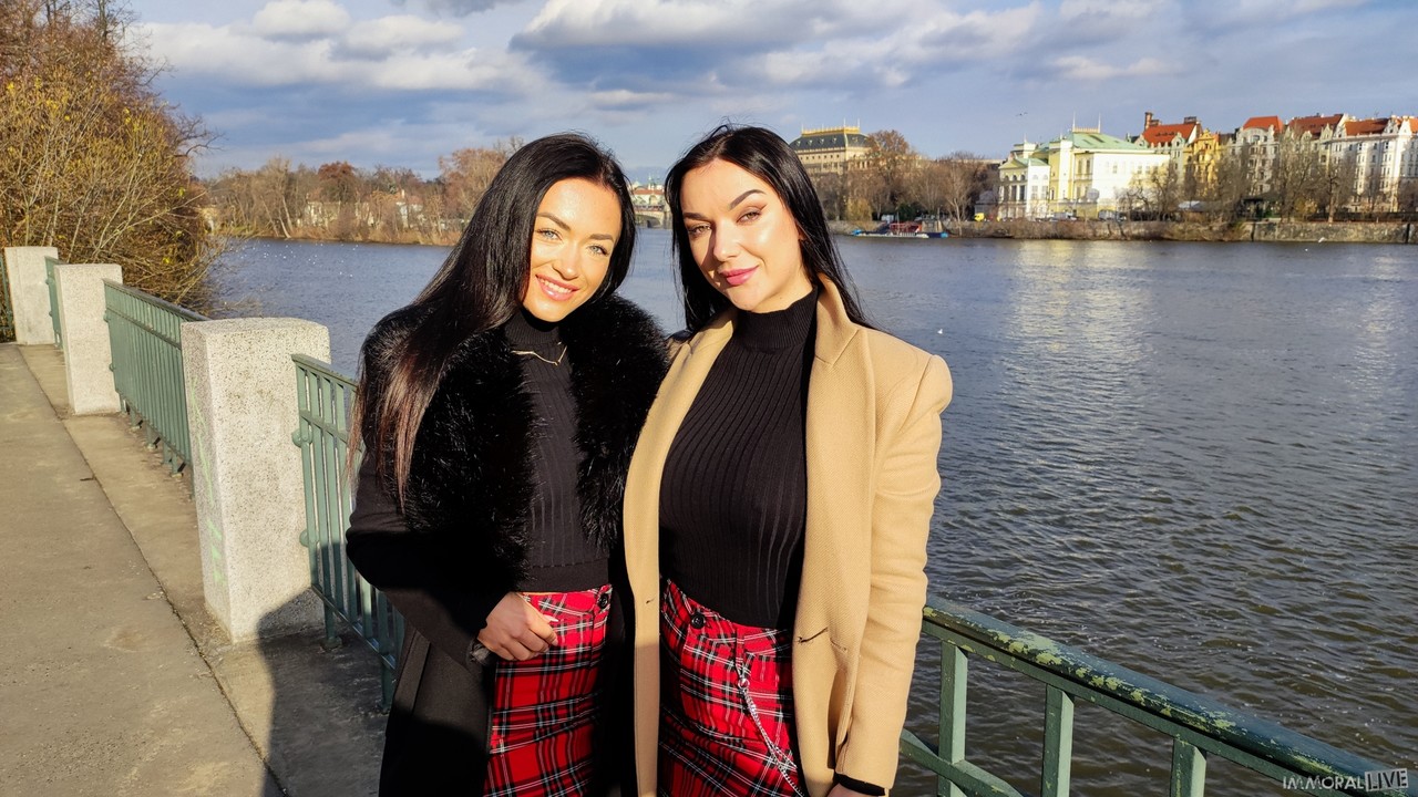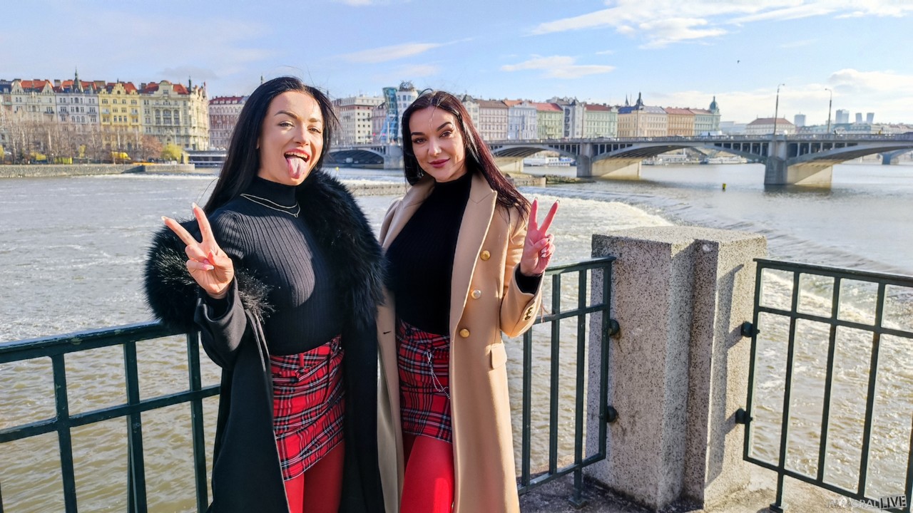 Menage POV com as tchecas gostosas Zuzu Sweet e Lady Gang levantando saias curtas combinando e meias-calças ao ar livre em realidade pública.