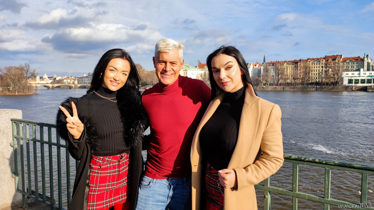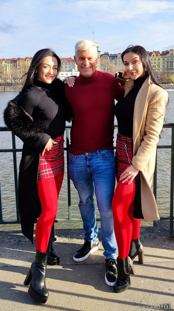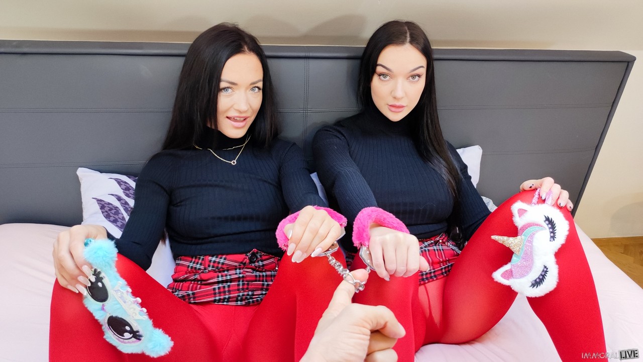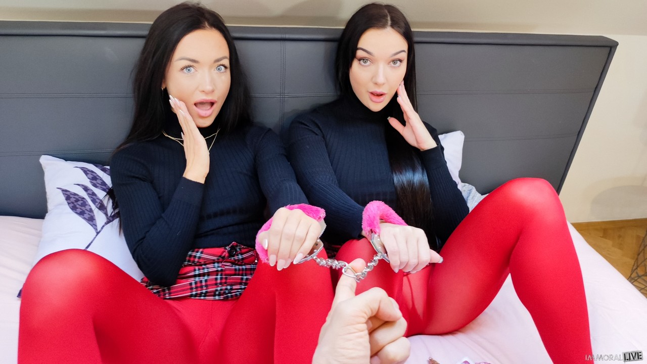 Menage POV com as tchecas gostosas Zuzu Sweet e Lady Gang levantando saias curtas combinando e meias-calças ao ar livre em realidade pública.