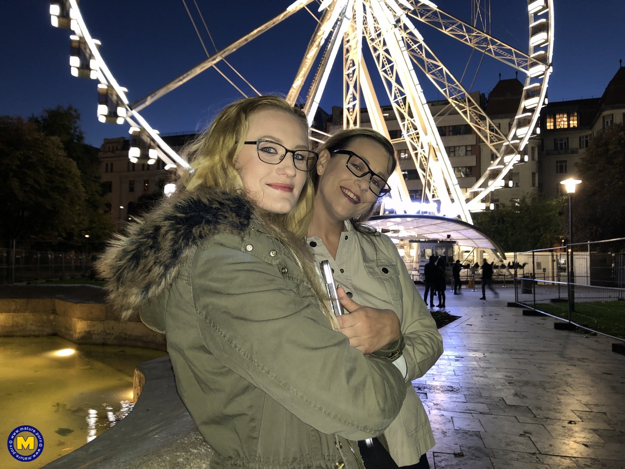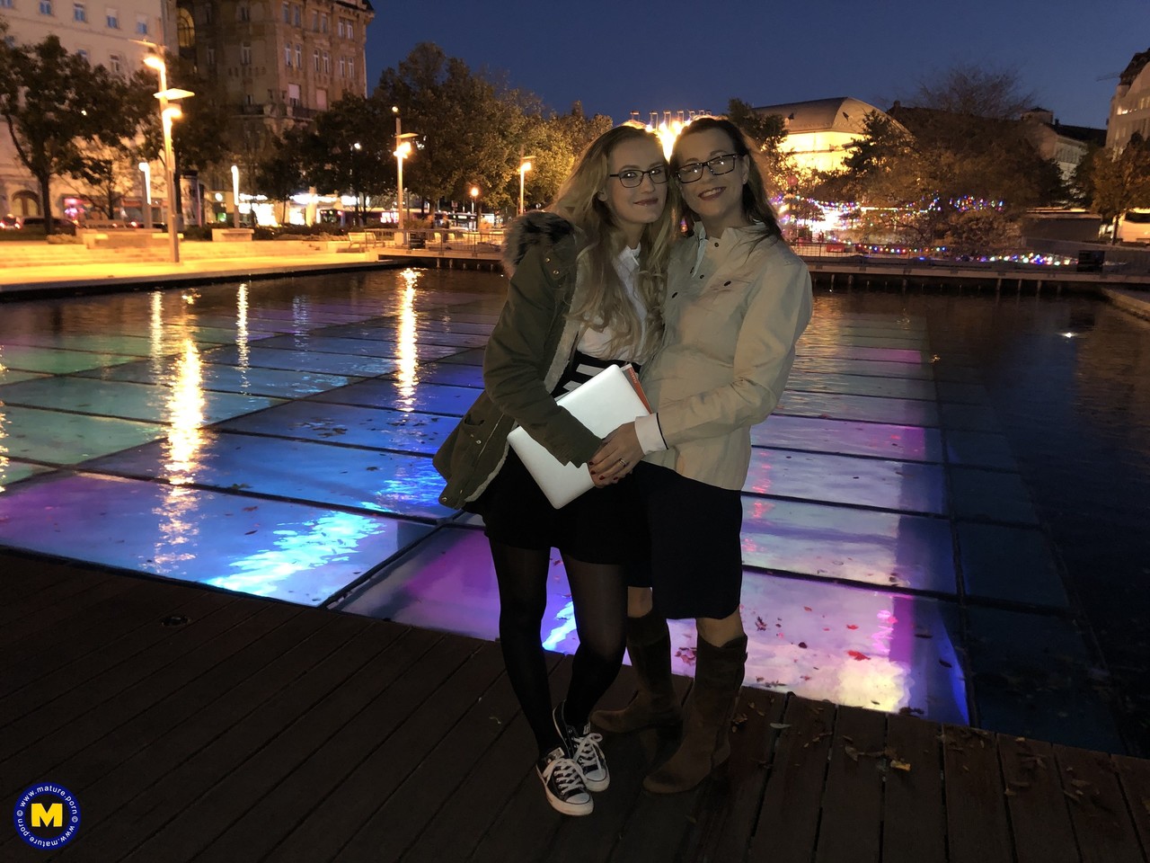 Loira madura britânica de óculos coloca bola de boca em adolescente tímida em público antes de sexo strap-on lésbico amador apaixonado, MILF de reality ensina novata nerd.