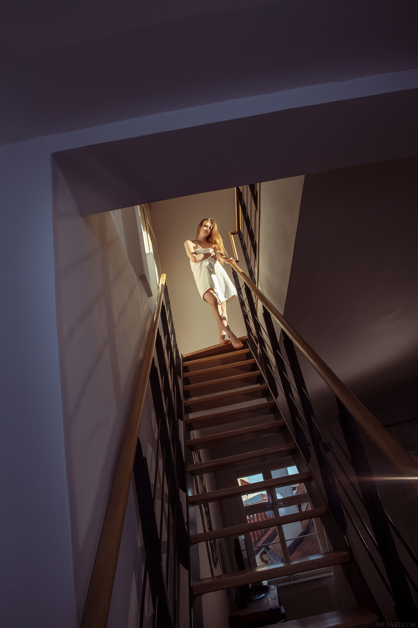 A doce adolescente ruiva Bretona se despia nas escadas, exibindo seus pequenos seios, sua boceta pálida e depilada e seu traseiro perfeitamente arredondado em um provocante striptease.