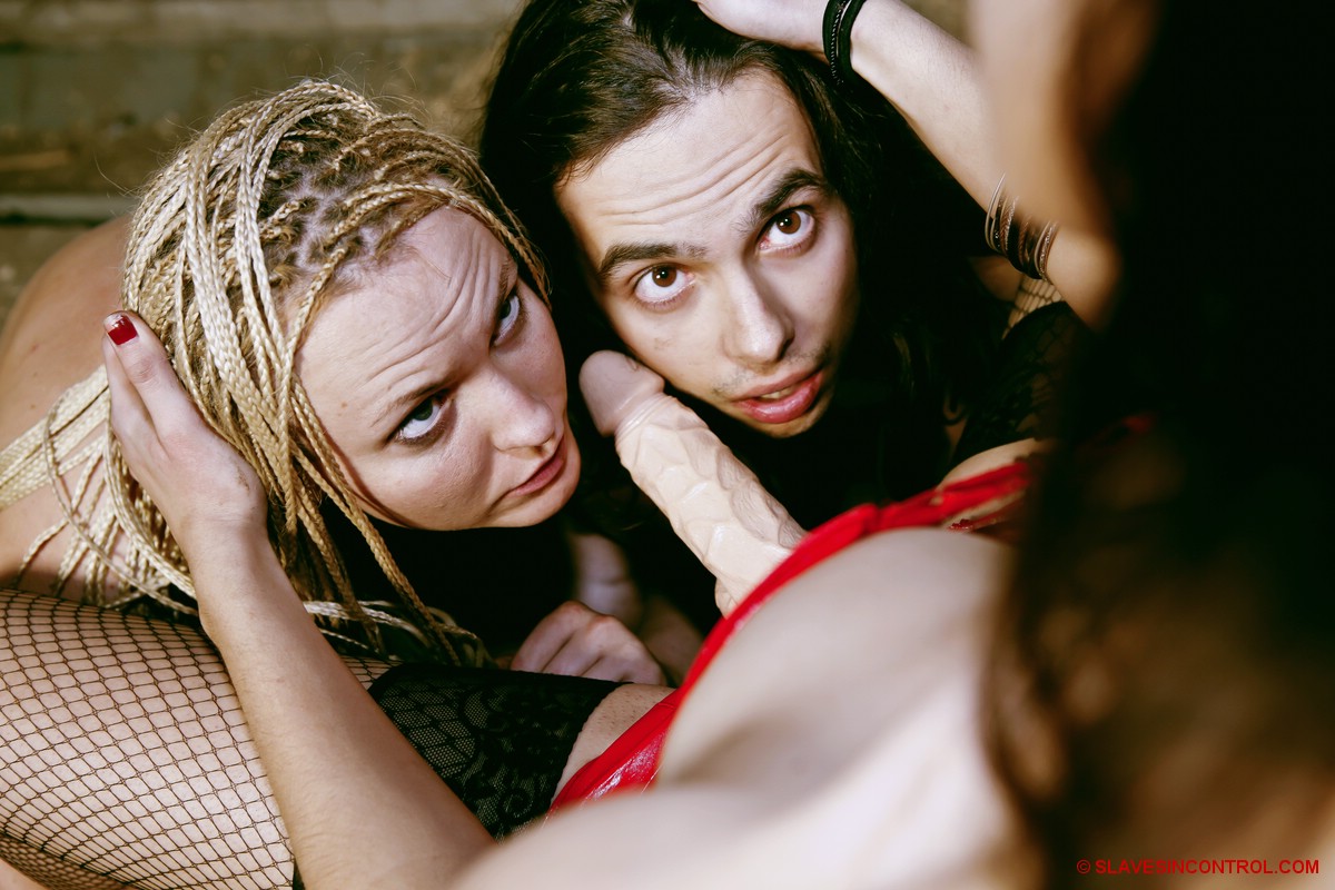 Uma mulher dominante de látex pega um casal submisso em um trio FFM com um consolo, meias, lambendo a vagina, 69.