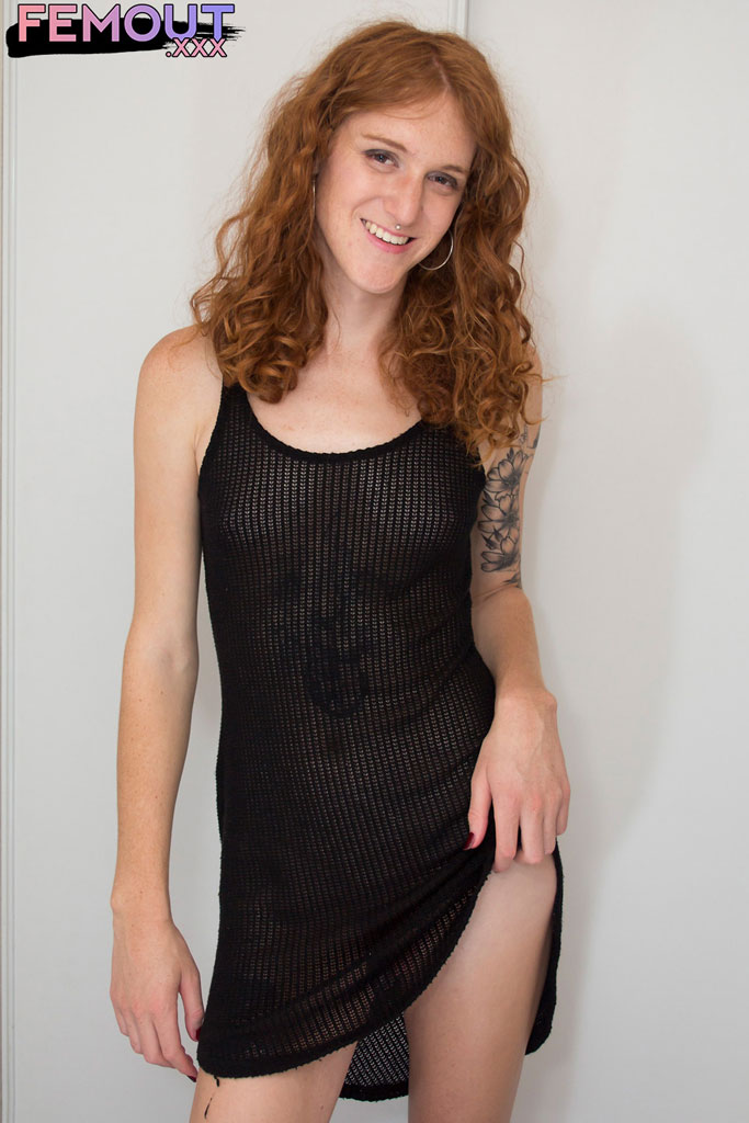 Assista à magra transexual ruiva Lucy Blue tirar toda a roupa, abrir as pernas longas e exibir seu corpinho de sissy fofo na galeria exclusiva do Femout XXX.