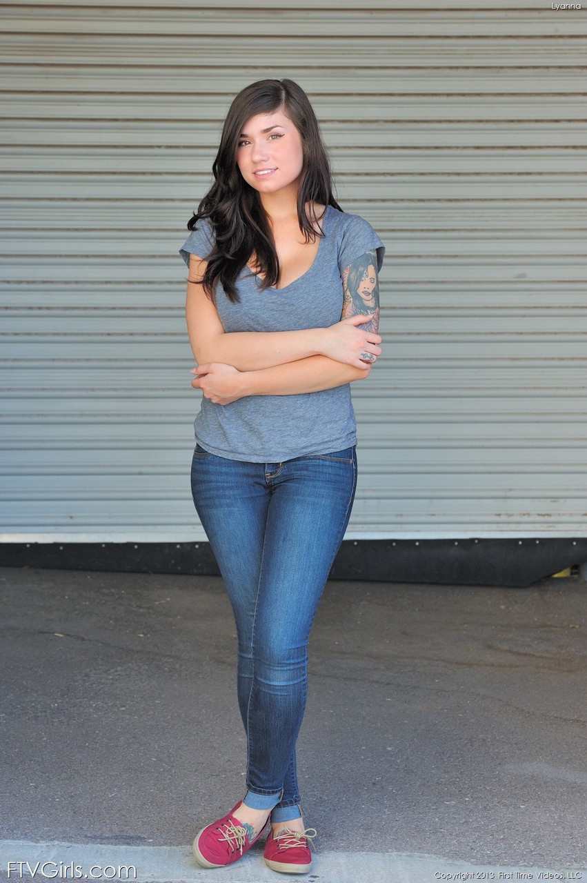 Busty brunette teen Lyanna strips in public, flashing her huge natural tits and inked skin while peeling off tight jeans to reveal her shaved pussy.
