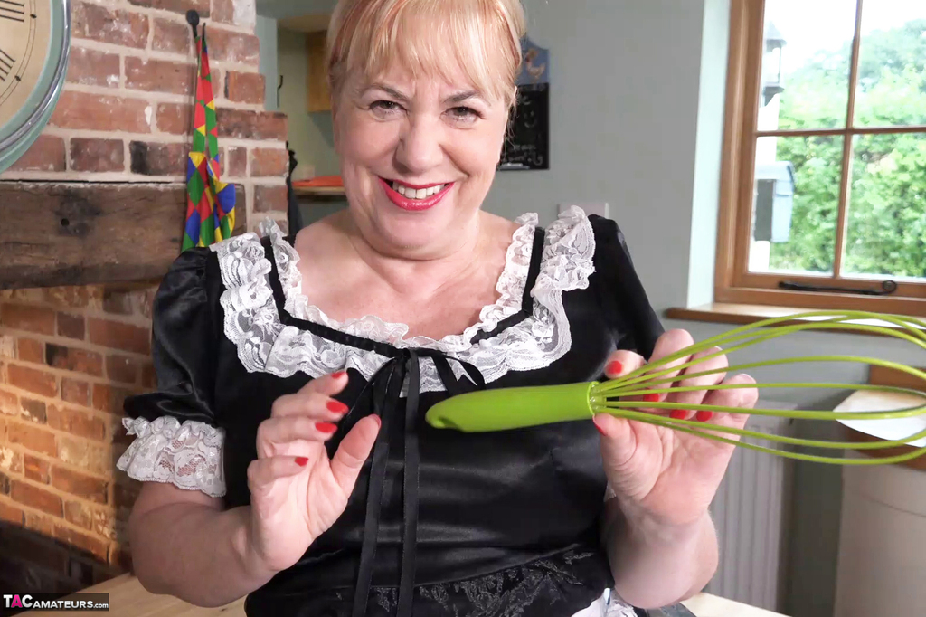 British granny Speedy Bee shoves kitchen tool in shaved granny pussy, gets pussy licked, then delivers sensual blowjob.