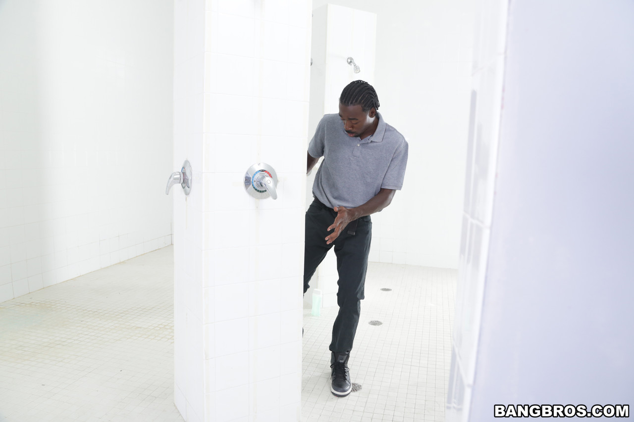 Petite busty ebony Dani Dolce caught masturbating in locker room, rail-fucked doggy style by big black cock, huge cumshot on her round African ass.