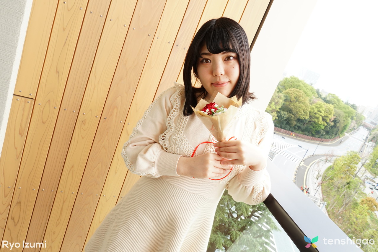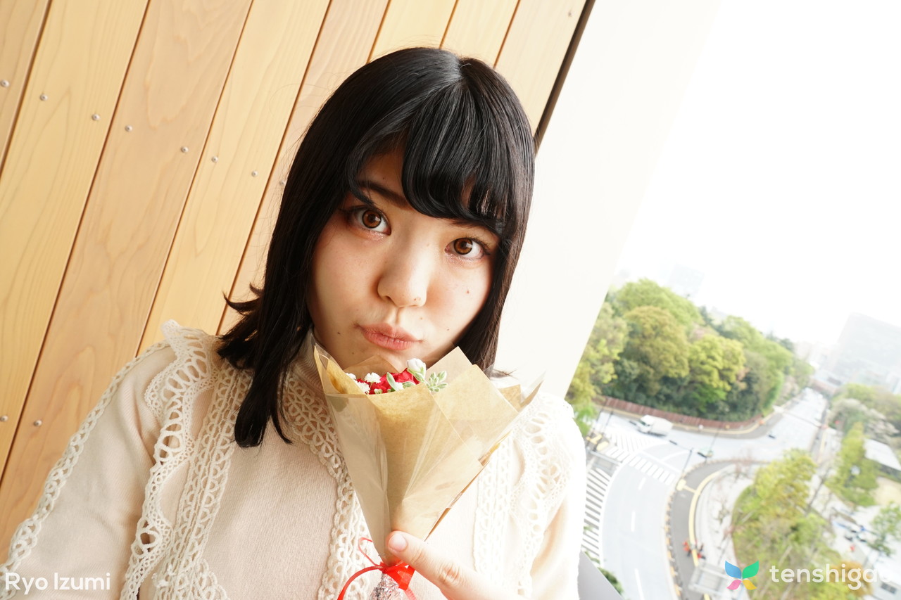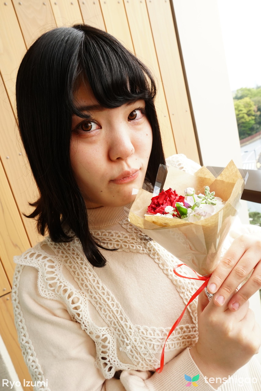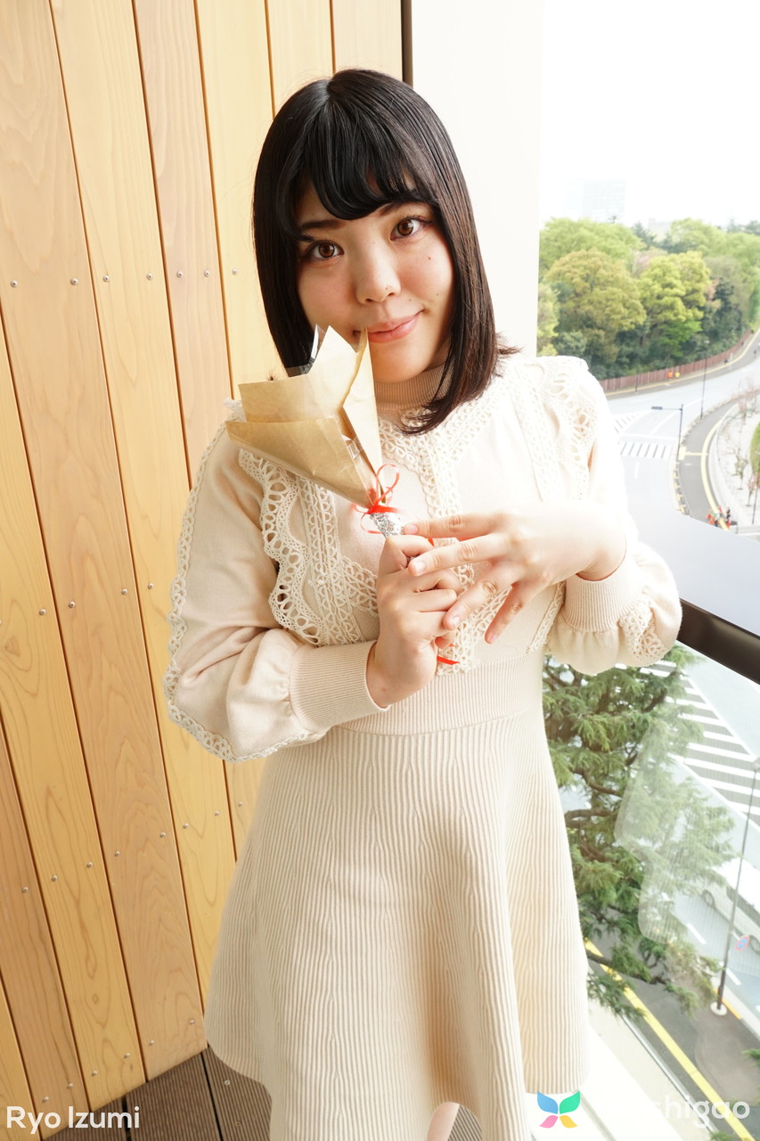 Очаровательная японская тинейджерка Рё Идзуми поражает в милой юбке, демонстрируя невинное личико и шикарные каштановые волосы в сольном ню-сцене без обнажения — идеальная азиатская девочка, дразнящая букетом.