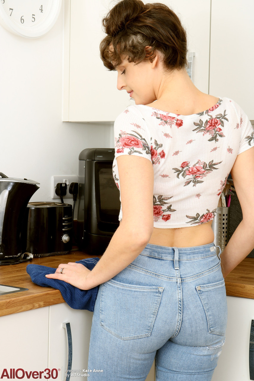 Пышногрудая MILF Кейт Энн раздевается на кухне, обнажая огромные натуральные сиськи и гладко выбритую киску под джинсами и бельём, широко раздвигая ноги для идеального вида.