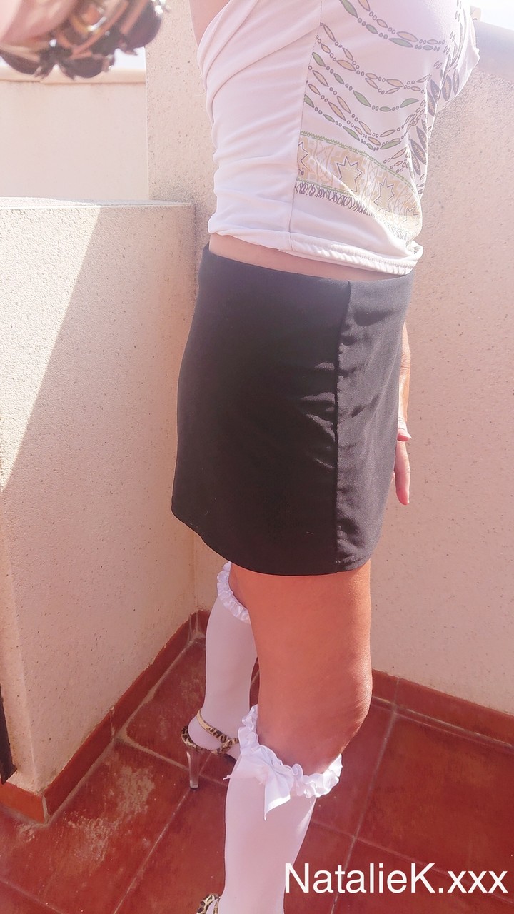 Spanish MILF Natalie K teases with upskirt selfies, flashing her trimmed hairy pussy and big natural tits while standing in socks and no panties—homemade mature striptease.