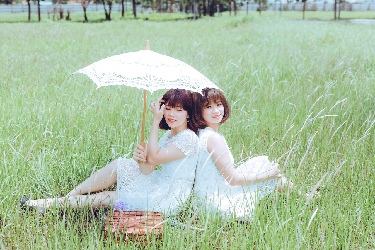 Beautiful Asian Models In White Dresses Pose In Meadow