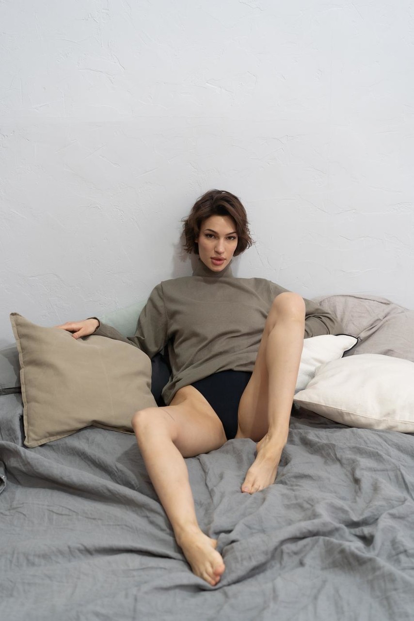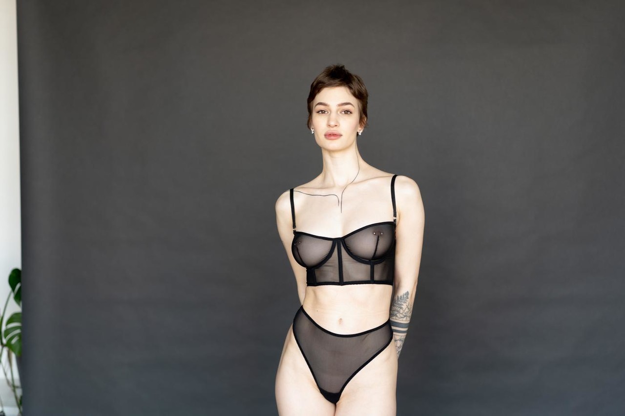 Short-haired teen Valentina Fedya strips see-through lingerie in steamy Bentbox amateur scene, flaunting tall pale body in socks.