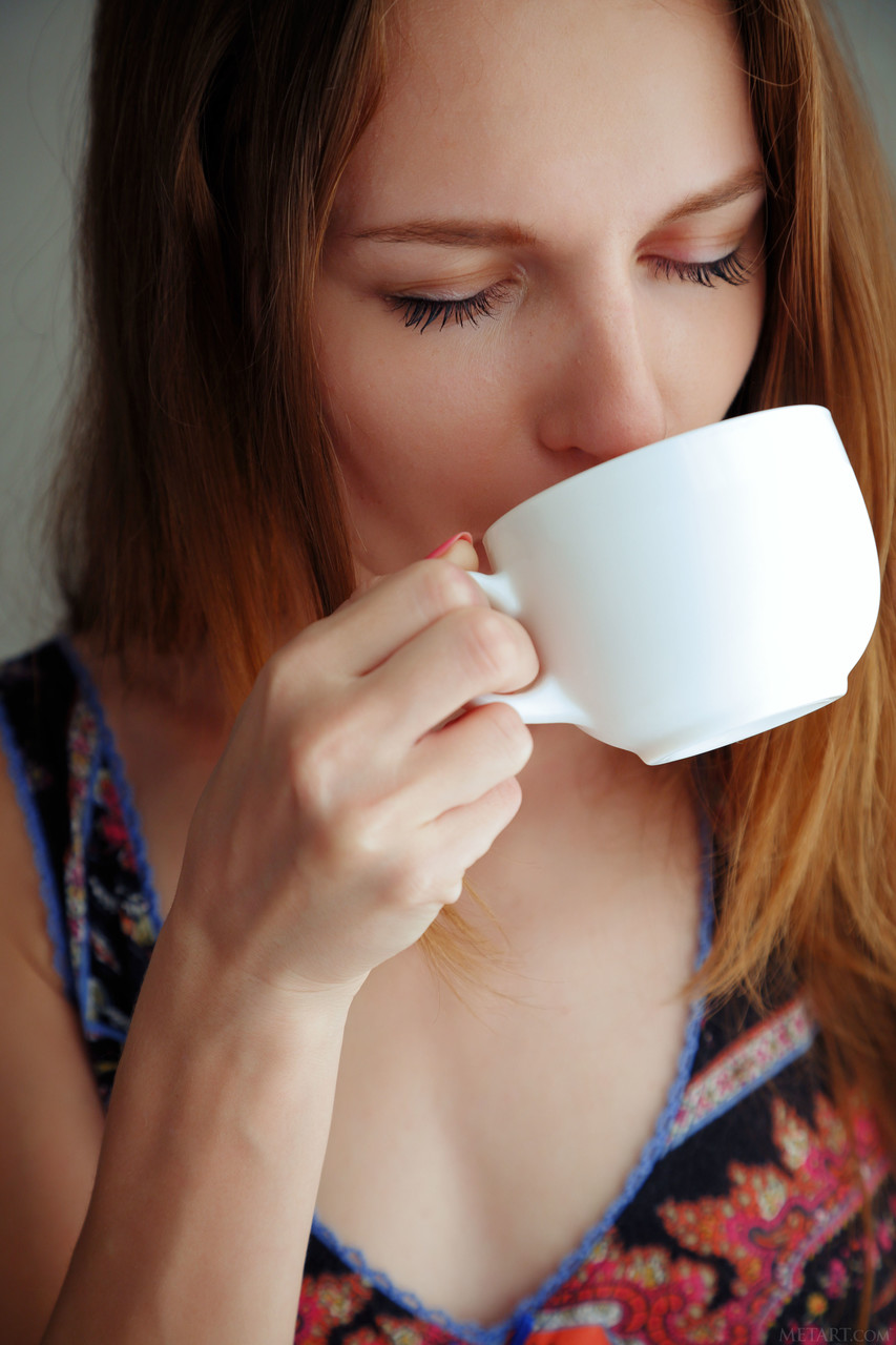 Cute Ukrainian redhead Sofi Shane sips coffee while stripping to reveal her perfect hairy teen pussy—petite, skinny, tiny tits, sexy Ukraine teen.