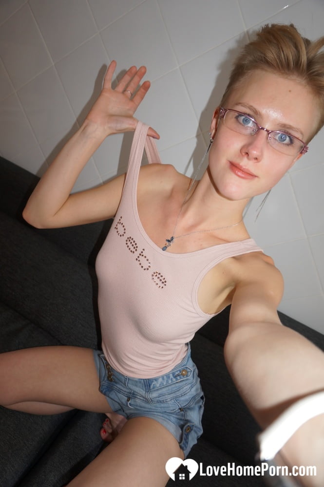 Nerdy Russian teen in glasses teases her tiny natural tits in a steamy homemade selfie, flaunting short blonde hair and super-skinny charm.